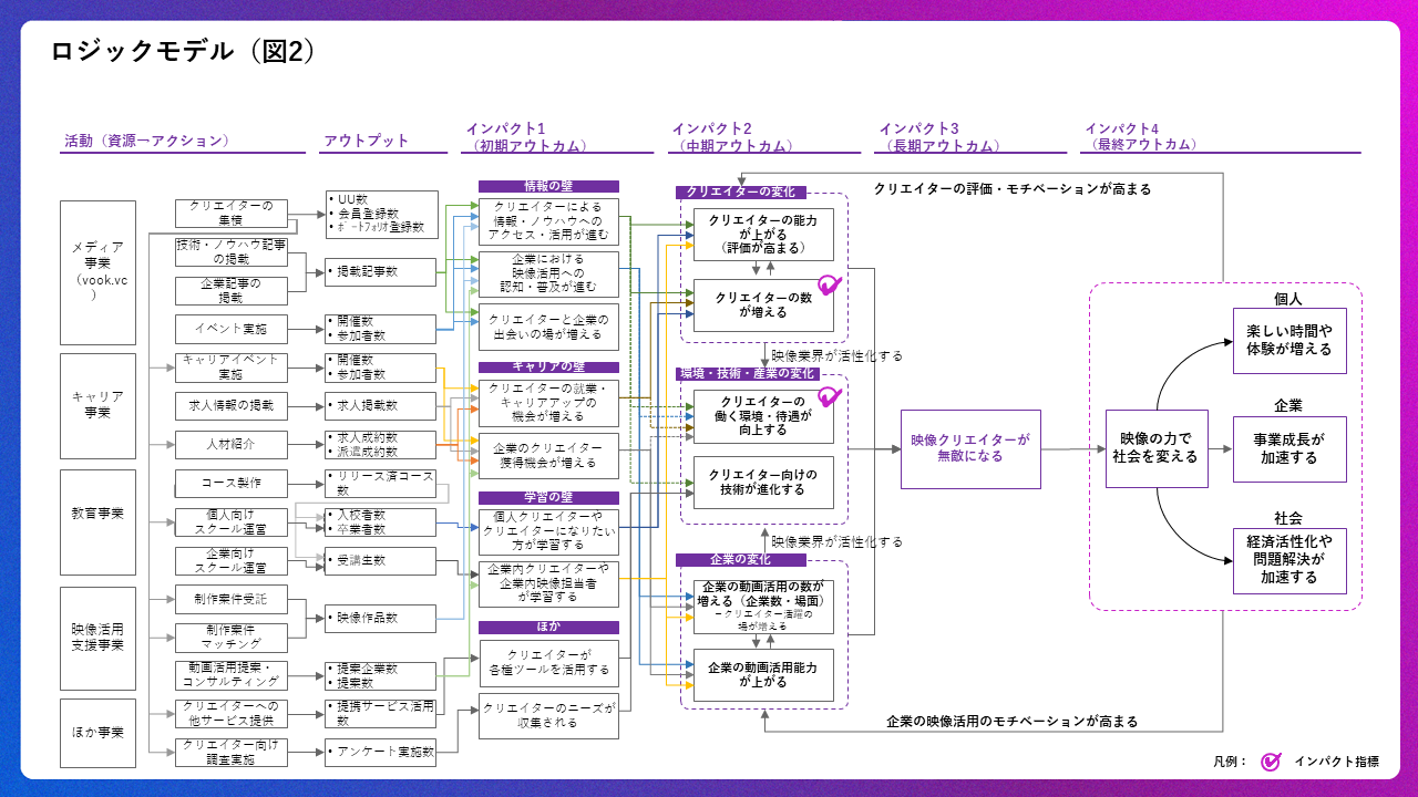 Vookが目指す社会的インパクトと戦略の詳細を可視化したロジックモデル(図2)は以下の通りです。