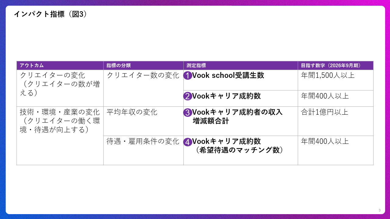 上記のロジックモデルに基づき、当社との協議の上、クリエイターの数や働く環境・待遇の改善・向上を測定指標(図3)として設定しました。今後はこれらの指標を定期的に測定し、両社で社会的インパクトの創出・拡大に向けて取り組んでいきます。