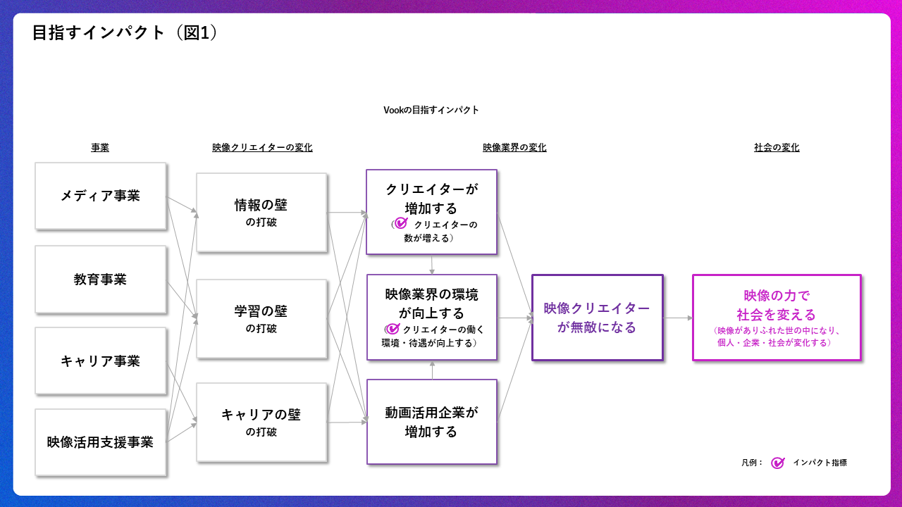 本件出資検討時のインパクト・デューデリジェンスを通して、ケイスリー株式会社(本社:沖縄県那覇市、代表取締役社長 幸地正樹、以下「ケイスリー」)と当社の支援のもとでVook経営陣が検討した結果、「映像の力で社会を変える」を長期的に目指す社会的インパクト(図1)としました。映像の力で個人の楽しい時間や体験、企業の成長や社会問題の解決が加速する世の中を目指していきます。
