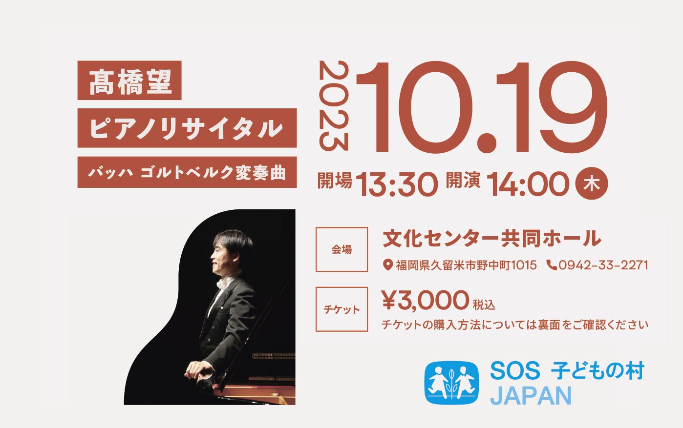 この度、萬年順子様(久留米市城島在住)により、2023年第3回目のSOS子どもの村支援コンサートを開催して頂くことになりました。今回は、ピアノ:髙橋望さんをお招きしピアノによるバッハの演奏です。バッハの音楽は、時代を超えて人々の心に響く普遍的な美しさを持っています。