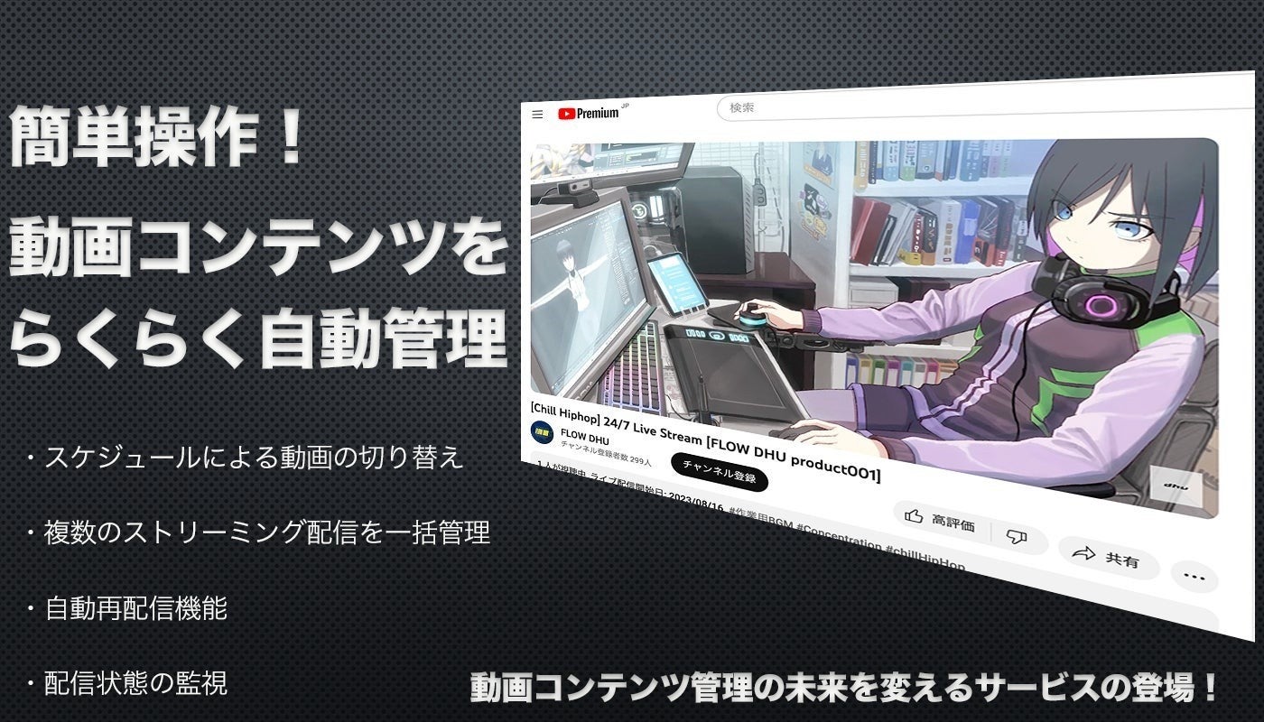 本サービスを利用いただくことで、ユーザーはYouTube上でのスケジュールに基づく動画切り替えや、ストリーミング配信の24時間自動管理が可能となり、動画コンテンツの効果的な提供を実現します。