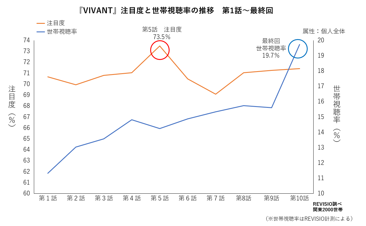 初回、最終回ともに注目度が1位だった『VIVANT』についてさらにどのような視られ方をしたのか分析しました。第1話から第10話までの、注目度とREVISIO計測による世帯視聴率の推移は上のグラフのようになりました。注目度が最も高かったのは第5話で73.5%、世帯視聴率が最も高かったのは第10話の最終回で19.7%でした。