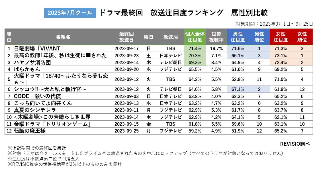 1位はTBSの『VIVANT』でした。REVISIO計測の視聴率でも1位となり圧倒的な人気を誇りました。また、7月クールドラマ初回放送注目度ランキング(https://revisio.co.jp/blog/XBr8oSYt)と比べてみると、『VIVANT』は初回放送でも1位でした。クールを通して注目されていたことが分かります。