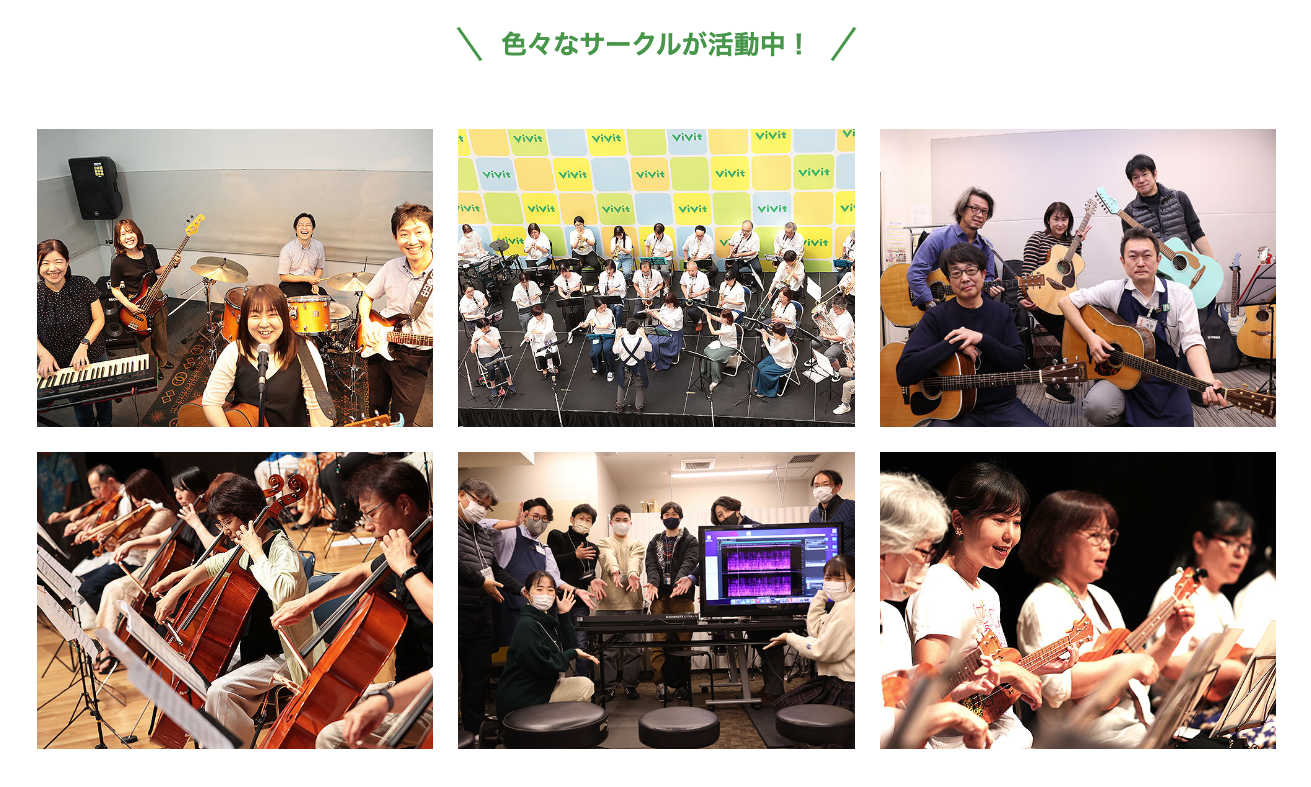 学生時代に吹奏楽部に所属されていた方が「また合奏がしたい」という想いでサークル活動に参加されている『管楽器アンサンブル(吹奏楽)サークル』や、ウクレレを買ってみたが「もっと弾けるようになりたいけれど、音楽教室の敷居が高い。」と感じる方が多く参加されている『ウクレレサークル』など、サークル活動を通して出会った仲間と楽しみ、弾き方などを教えあう姿も多く見られます。その数なんと、450サークル以上!「気軽に」「自分に合った」「同じ趣味で盛り上がれる」、そんなコミュニティに参加できます。活動が盛んなサークルは、定期演奏会などのイベントも開催しています。