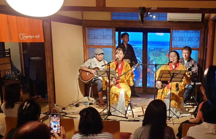 そのオープンを記念して、店主も所属する四谷琉球倶楽部「かなさんどー」のメンバーが東京から来場(=大阪初公演)、残暑厳しい今年の夏の締めくくりを、沖縄の景色と古民家の雰囲気の中、三線の音色に浸りながら約30名集まったお客様と楽しむことができました。