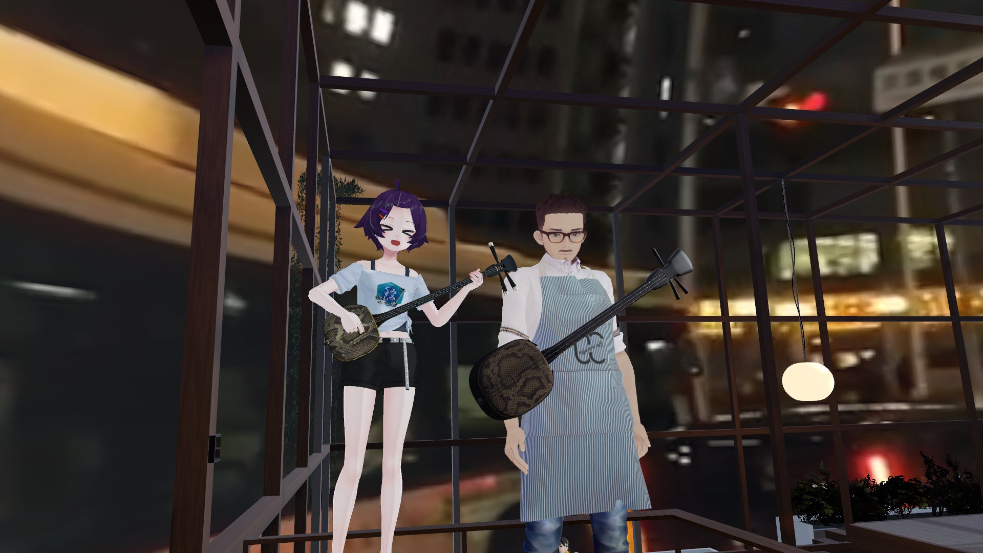 二次会には、リアル会場の店主がバーチャルにアバターで訪問して、沖縄からの三線演奏を楽しみました