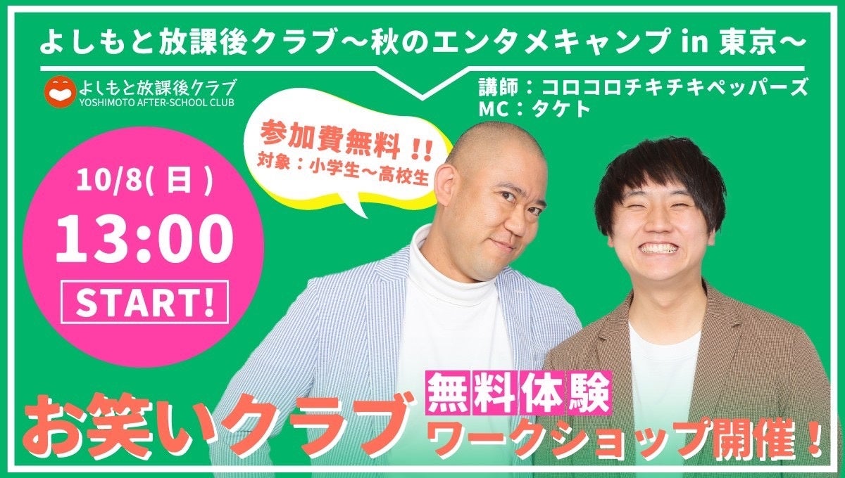 また、小学生、中学生、高校生を対象に、子どもたちが放課後の時間を利用してエンタメなどを楽しく学べるクラブ活動「よしもと放課後クラブ東京校」では、文化の秋にふさわしい「よしもと放課後クラブ エンタメ秋のキャンプ in 東京」を同日に開催します。当日は、漫才ワークショップ、K-POPダンス教室が、入学前に体験ができます。講師は、コロコロチキチキペッパーズ(漫才ワークショップ)、A-NONとスカチャン(K-POPダンス教室)が務めます。