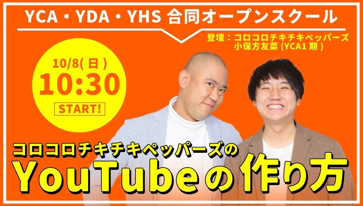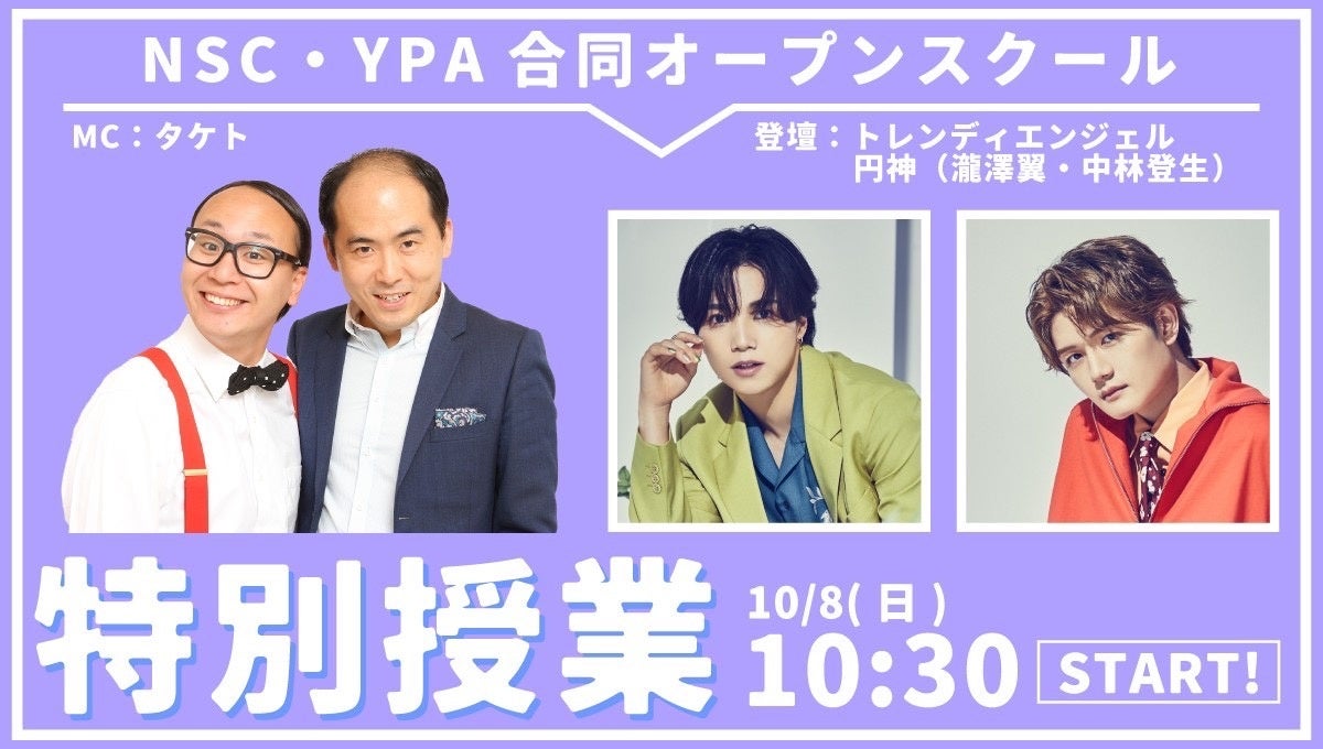 数多くのスターを輩出する国内最大規模のお笑い養成所NSC(吉本総合芸能学院)、マネージャー、構成作家、劇場・ライブプロデューサー、番組ディレクターetc…数多くの即戦力エンタテイメントスタッフを輩出するよしもとクリエイティブアカデミー(YCA)、俳優、パフォーマー、歌手、よしもとから“本格的”にデビューを目指すタレント養成所よしもとパフォーミングアカデミー(YPA)、よしもとでエンタメ×デジタルの最前線を学び即戦力を目指すスクールよしもとデジタルエンタテインメントアカデミー(YDA)、よしもとのスクールでエンタメを学び高校卒業資格が取れるよしもとの学校、吉本興業高等学院。これら5校からなる吉本興業グループの唯一の教育機関であるよしもとアカデミーは、 明日のスターを志す方やそのスターを縁の下から支えるスタッフを志す方に向けた「秋の特別合同オープンスクール」を10月8日(日)に開催します。NSC・YPA合同オープンスクールにはトレンディエンジェル、円神(瀧澤翼・中林登生)が登壇、YCA・YDA・高等学院合同オープンスクールにはYouTubeチャンネルが人気を博すコロコロチキチキペッパーズが登壇致します。