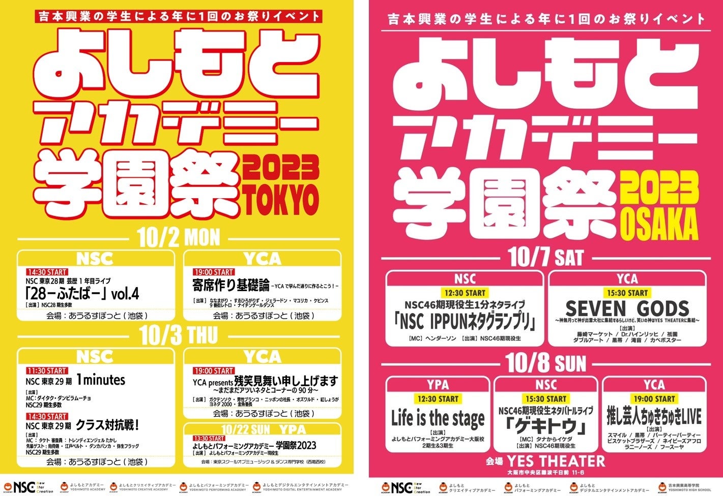 今年度もNSC、YCA、YPA、YDA、吉本興業高等学院、各校の生徒が「出演」または「企画・制作」する「学園祭」を東京校は10/2(月)月,3(火),22(土)、大阪校は10/7(土),8(日)に実施します!「NSC」は、現役生による1分ネタ、クラス対抗戦、さらに芸歴1年目の東京28期生による同期ライブを開催。「YCA(よしもとクリエイティブアカデミー)」は、人気芸人を招いての生徒企画のお笑いライブを実施。また学園祭全体の運営も担当します。「YPA(よしもとパフォーミングアカデミー)」は、歌・ダンス・演技を織り込んだステージを披露!そして「YDA(よしもとデジタルエンタテインメントアカデミー)」の生徒は、公演やPR動画を制作して、各公演で上映します。吉本興業の生徒たちの若きパワーが集結する、年に1回のお祭りイベント!アカデミー生の挑戦と発想、パフォーマンスを、ぜひお楽しみください!