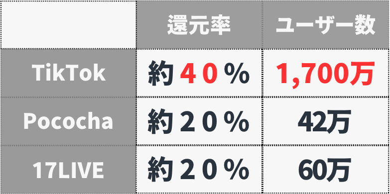 国内主要なライブ配信プラットフォームと比較すると一目瞭然ですが、桁違いにTikTokのユーザー数は多いです。こうした背景から、今後ライブのプラットフォームはTikTok以外残らないという見方もあり、数多くのプロライバーたちがTikTokLIVEに移籍している現状があります。