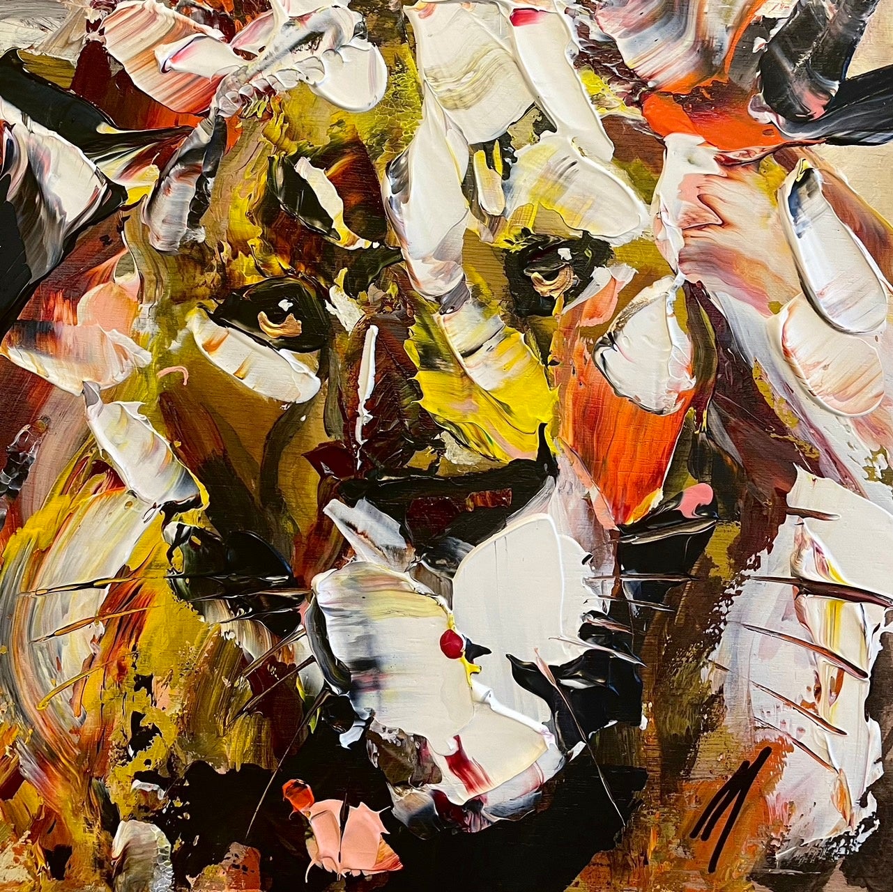 主に絵具を用いて、「動物のリアルな姿」と「あたたかな感情を表現した色」がリズミカルな筆致で融合した絵画を描いています。