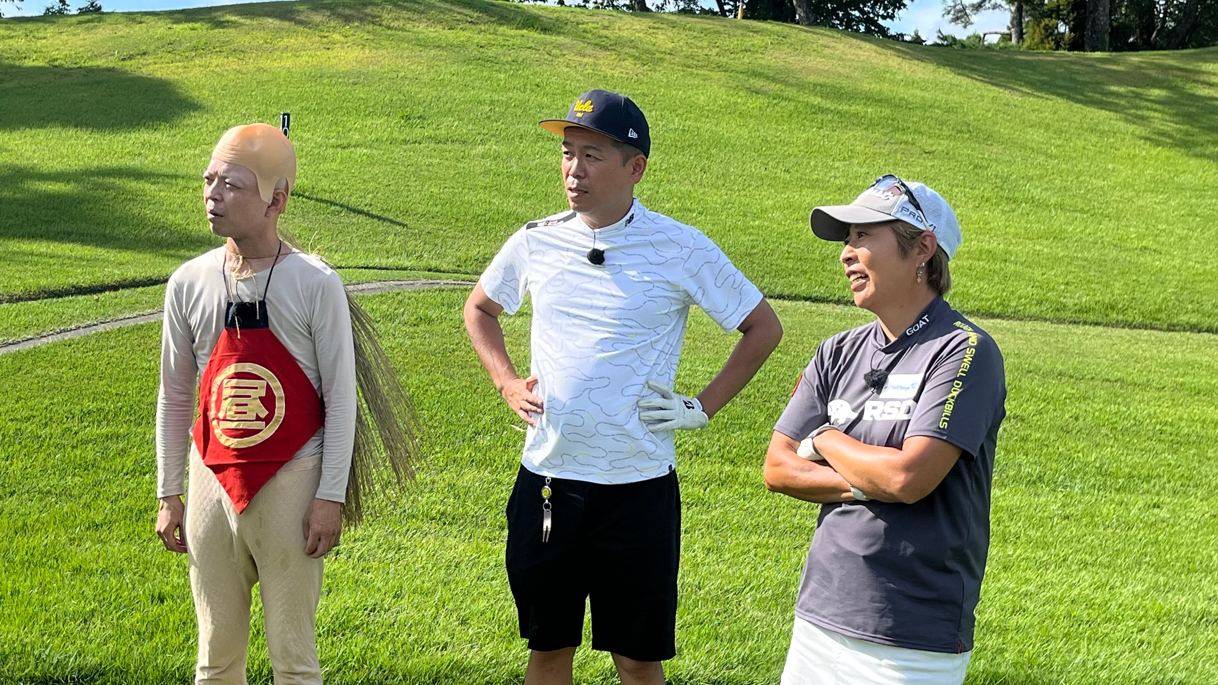 一方、トシは、力強い味方・佐々木慶子プロとペアに。キャディは、“子泣き爺”の格好で参戦した昼メシくんです。昼メシくんは、妖怪に絡めたボケを連発して場を盛り上げました。