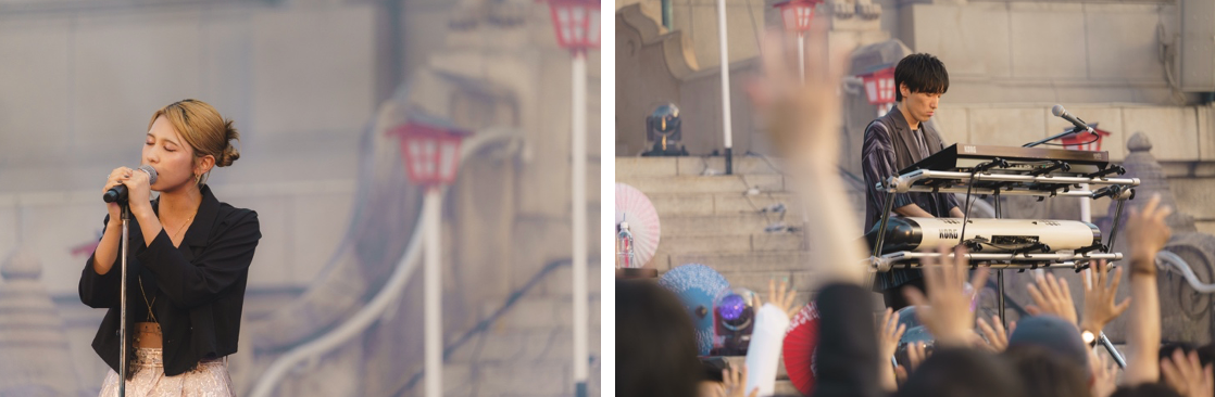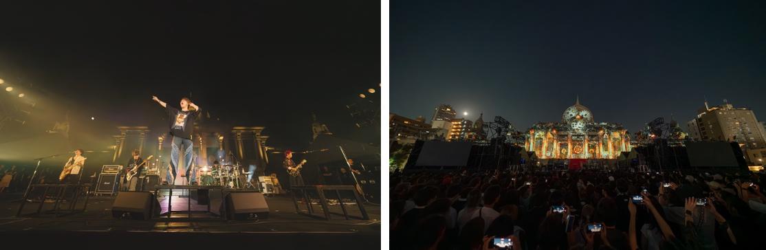 そして3組目のアーティストとなる水曜日のカンパネラのLiveステージが始まる。キュートかつ華やかな衣装に身を纏い、パワフルかつグルーヴサウンドで会場のお客さんとの一体感を生み出し、熱いステージを披露した。4組目のアーティストは聞く人の暮らしの中にそっと入り込む歌を届ける5人組バンドのwacci。Live頭には築地本願寺の外観に圧巻のプロジェクションマッピングが投影され壮大な演出が繰り広げられ、ストリーミング再生1億回再生を突破している「恋だろ」ほか「別の人の彼女になったよ」など、ヒット曲を中心に全6曲のパフォーマンスを披露した。