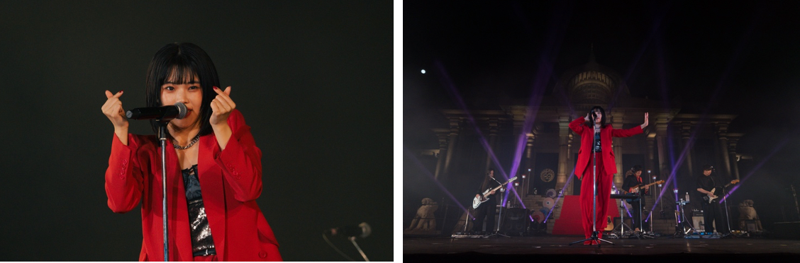 そしていよいよフィナーレとなり、今回のイベントでとりを務めたのは、先日6/29に大人気の中、東京ドーム公演で約8年の活動に終止符を打った元BiSHメンバーのアイナ・ジ・エンド。Live冒頭、華やかであり、どこか哀愁が漂う、その中で生命の強さを感じさせるような洗練されたプロジェクションマッピングでLiveステージが始まる。パワフルかつソウルフルな彼女のステージは冒頭から観客の熱を帯び、見る者すべてを釘付けにした。Live中盤、楽曲「Red:birthmark」で、MVに出演しているアオイヤマダがサプライズで登場。ファンの中では、もしかして??との気持ちで待ちに待ったかのような心の底から溢れんばかりの歓声が会場を埋め尽くした。感情に身を任せたコンテンポラリーとも取れる2人のパフォーマンスで特別な演出を披露したアイナ・ジ・エンドは、現在話題となっている岩井俊二が監督を務める音楽映画『キリエのうた』主題歌「キリエ・憐れみの讃歌」を歌唱するなど、築地本願寺の空間の中で、メモリアルなLiveを繰り広げ、有終の美を飾った。