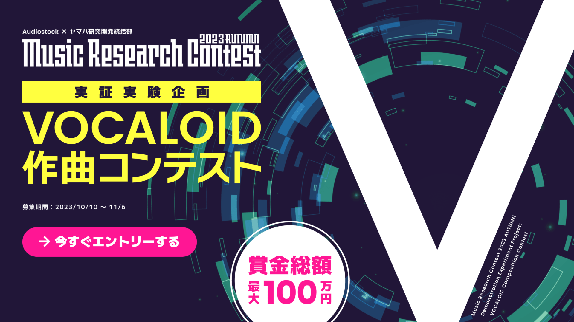 ヤマハが2023年8月に立ち上げたVOCALOID β-STUDIO は、ヤマハが期間限定で設立した『研究スタジオ』で、歌声合成をより広い世界へ拡げるための実証実験を行っています。当社が運営する世界最大級のストックミュージックサービス「Audiostock」では90万点以上の音楽作品を販売しており、様々なシーンでの音楽の商用利用における実績やノウハウを元に、ヤマハの実証実験企画を共に推進するため、新たにコンテストを共催することとなりました。