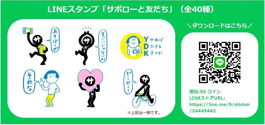 誘い上手なサボローと、そんなサボローとうまく付き合いながら勉強をがんばるYDKがLINEスタンプになりました。全40種類のLINEスタンプは、ご家族や友だちとのトークなど、日常のさまざまなシーンでお使いいただけるデザインとなっています。