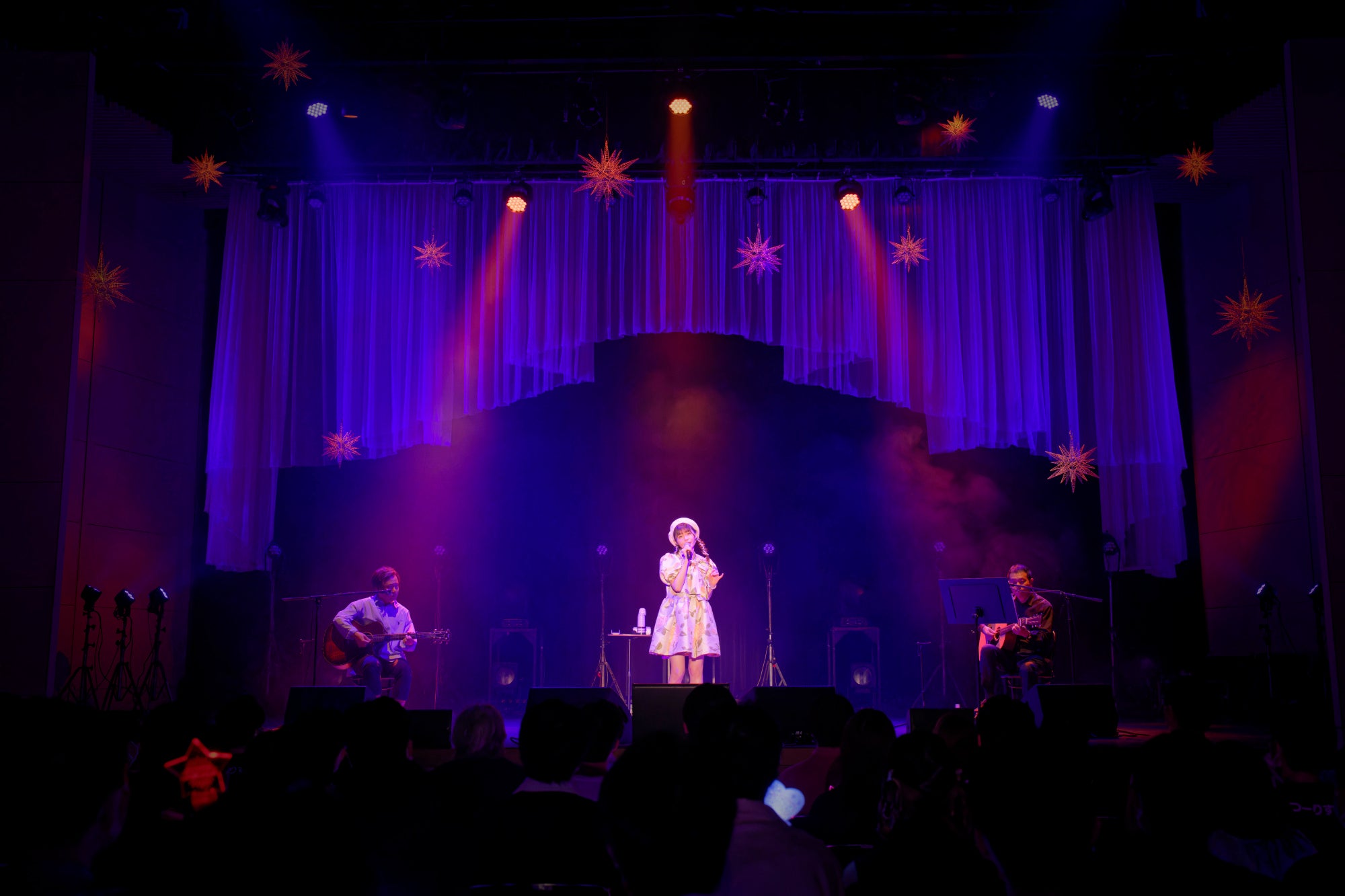 ライブの後半は、ミニアルバム『Starry Garden』に収録されているシティポップの「ひと足」から。少し大人びた歌声でのパフォーマンスに、改めて曲の良さが伝わってくる。続く「突風スパークル」では、緑に染まった会場に、爽やかな風を吹かせていた。白いスポットライトに照らされながら歌ったトゥインクルな冬の曲「記憶ファンタジック」も素晴らしかった。サビでは会場全体が白い光に包まれ、雪の景色が見えるかのよう。心がキュンとする素晴らしいメロディの楽曲に、ひと足早い冬の贈り物をもらった気持ちになっていると、今度は斬新な楽曲「Lavender Tears」へ。ドラムのビートとピアノというミニマルなサウンドとボーカルだけの曲を、強弱や緩急をうまく使いながら歌っていくすわわ。曲終盤の〈「わたし、平気だよ」〉のセリフもしっとりと聞かせ、前へ向かう強さを表現する。