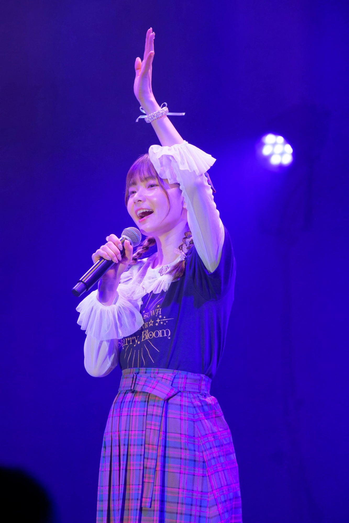 そして早速、声を出し曲「Lilac」を用意する優しいすわわ。のっけから大きな声が響き、途中のコール&レスポンスもバッチリ決まる。すわわもステージを左右に移動しながら声を届けていた。パープルなペンライトが力強く揺れ、会場の熱気もグンと上がると、人気曲「Wonderland!!」では、大きなクラップが起こる。サビでのキュートなダンス、そして真っ直ぐな歌声に、会場は幸せに満ち溢れていた。ラスサビではステージも客席もカラフルに光り、鮮やかな景色を見せてくれた。続くポップな「ショコラ フレーズ」は、切ない歌声で聴かせる。ピンクのライトに包まれながら、スイートに、そして表情豊かに歌っていたのが印象的だった。