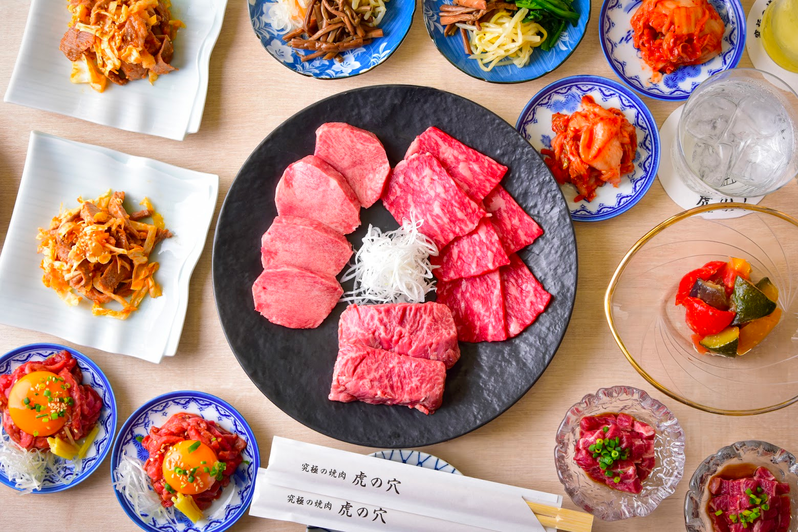 おすすめメニューは、虎の穴自慢の和牛のみを使った人気の『極み焼き盛り合わせ』(ハラミ/トモサンカク/シンシン/サガリ)(5,000円/5,500円税込)