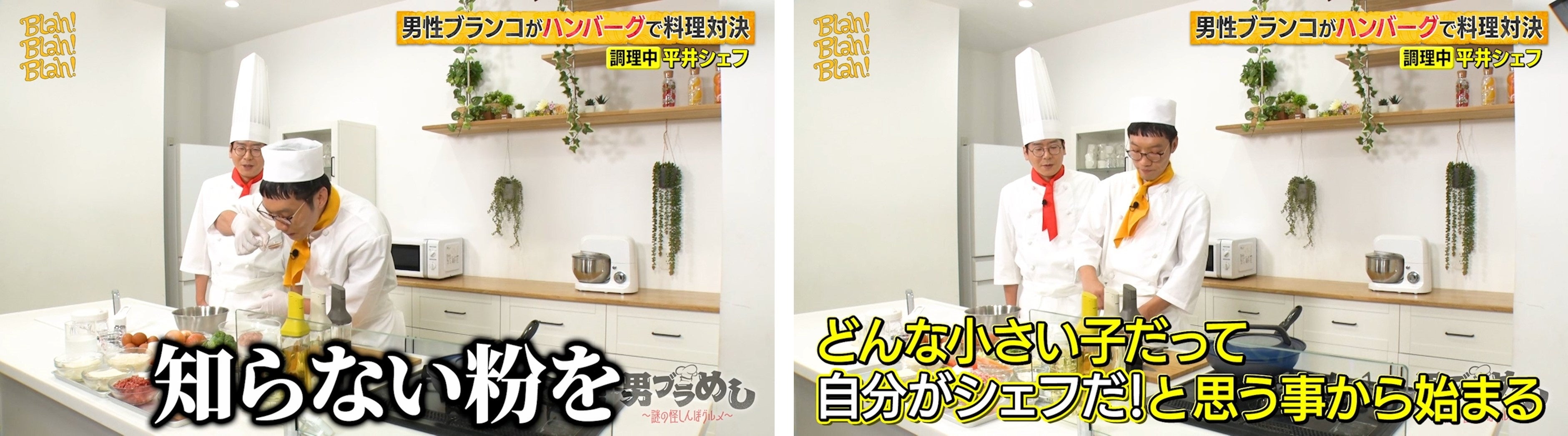 芸人MCによる日替わりトークバラエティ『Blah!Blah!Blah!』にて男性ブランコ初の冠番組となる「男ブラめし~謎の怪しんぼグルメ~ 」の第1話を2023年10月12日(木)21:00より独占配信いたします。世界の謎めいた怪しい料理『怪しんぼグルメ』づくりに挑戦する新番組で、初回は料理の腕前をチェックすべく、家庭料理の定番・ハンバーグをレシピを見ずに作ります!