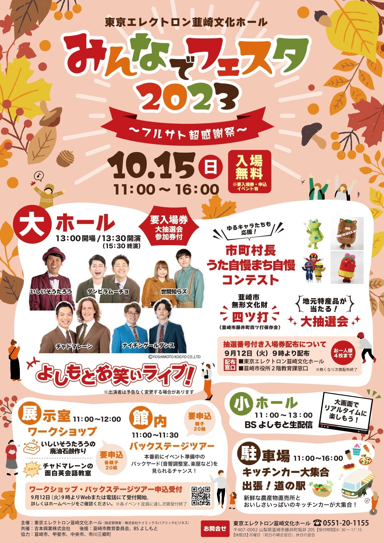 全国各地の自治体と吉本興業が連携し、地域の魅力をPRすることを目的としたイベント「フルサト超感謝祭」。この度、韮崎市にある東京エレクトロン韮崎文化ホール主催で山梨での開催が決定いたしました。地元出身のダンビラムーチョ、世間知らズ、ナイチンゲールダンスや住みます芸人など山梨にゆかりのある芸人が集結し、お笑いライブをはじめ、韮崎市の伝統芸能「四ツ打」など山梨愛溢れる企画で盛り上げます。
