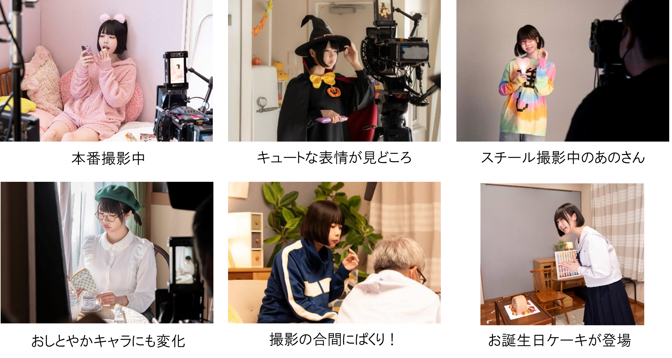 アーキテクト「タレントパワーランキング」の「2023年上半期にブレイクしたタレントランキング」で女性部門1位となるなど、メディアやSNSで引っ張りだこなあのさんが文学少女姿でスタジオ入り。様々なシーンに合わせてプチを楽しむイマドキの女の子をテーマに女子高生、ギャル、ヲタク女子などになりきりテンポよく撮影が進みます。「SNS with プチ」では普段あまり着ないピンク色の衣装を着用しながらスマホを見たり、文学少女ではおしとやかに本を読みながらプチを食べたり、ハロウィンの仮装ではニコニコと明るい表情を見せながらプチを食べたりと、6つのシチュエーションに合わせた表情にも注目です。撮影の合間にはプチシリーズを食べながらスタッフと談笑する場面も。普段からプチシリーズを食べているというあのさんのプライベートな一面も見せてくださいました。