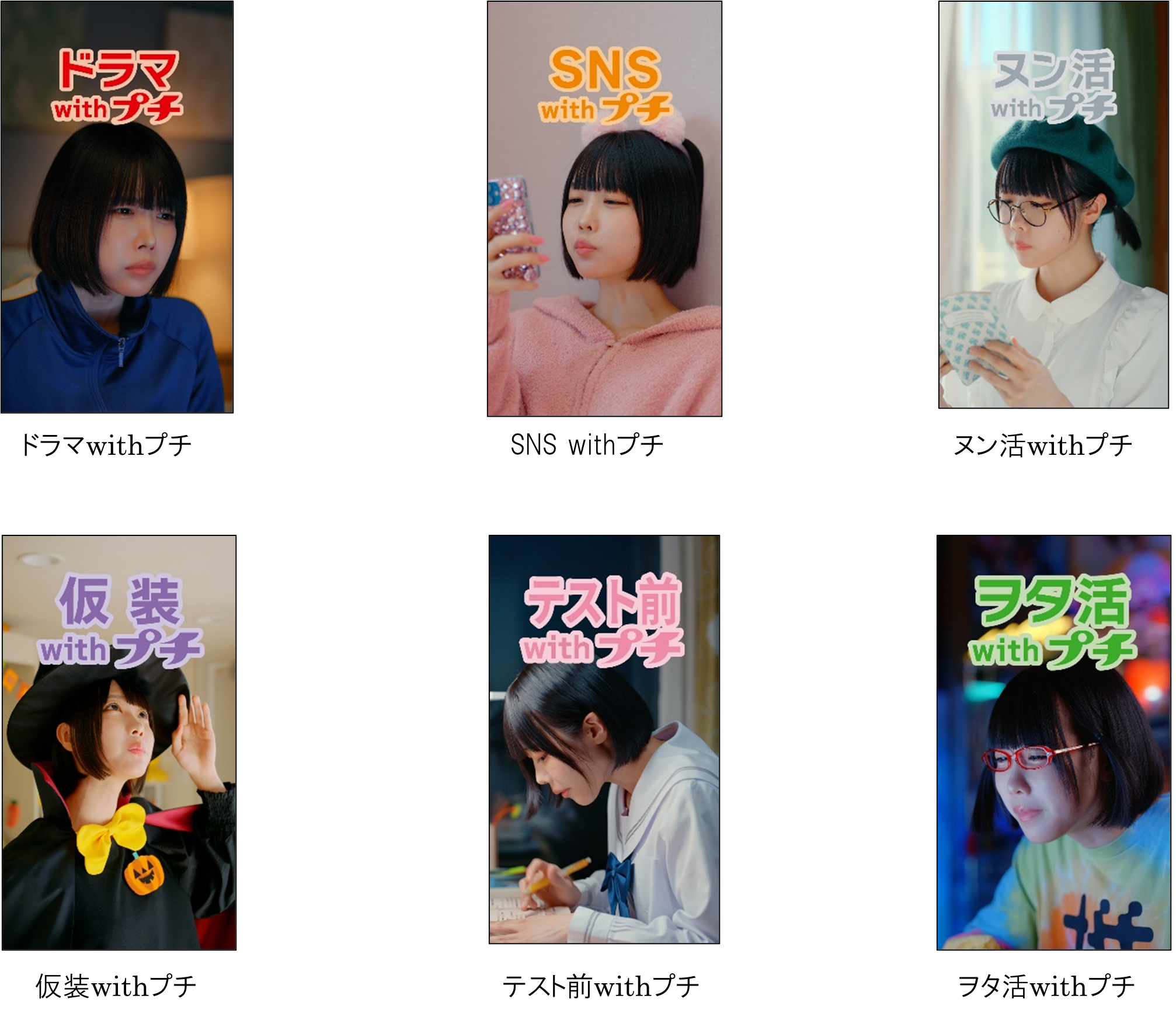 あのさんが6人の“プチ好き女子”に変化し、6種類のプチを「ながら食べ」するオムニバス形式の動画です。涙を目に配信ドラマを観ながら食べる女子、スマホでSNSをしながら食べるギャル、ハロウィンで仮装の支度をしながら食べるアクティブな女子、テスト勉強をしながら食べる女子高生、昼下がりに読書をしながら食べる文学少女、ネットで推しグッズを物色しながら食べるヲタ活女子。自分らしさを大切にそれぞれの時間を楽しむ女子たちと、そんな自分らしいライフスタイルに「ちょうどいい」、いつでも手軽で美味しく種類も豊富なプチシリーズとのひとときを描く内容となっています。