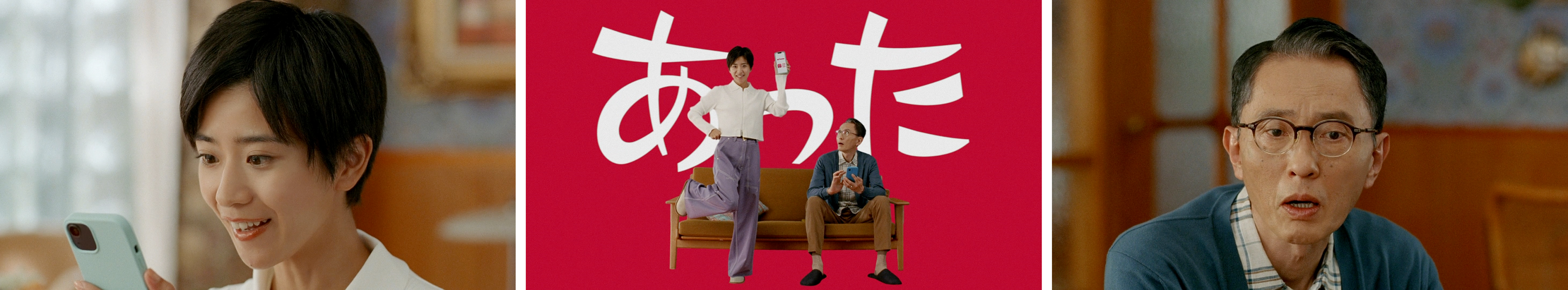 いい部屋を見つけて「アットホームであった~♪」と歌って踊りながらうれしさを表現する黒島さんと、それを少し寂しそうな表情で見つめる松重さん。親子の掛け合いを通して「アットホームで理想の住まいが見つかること」を訴求します。