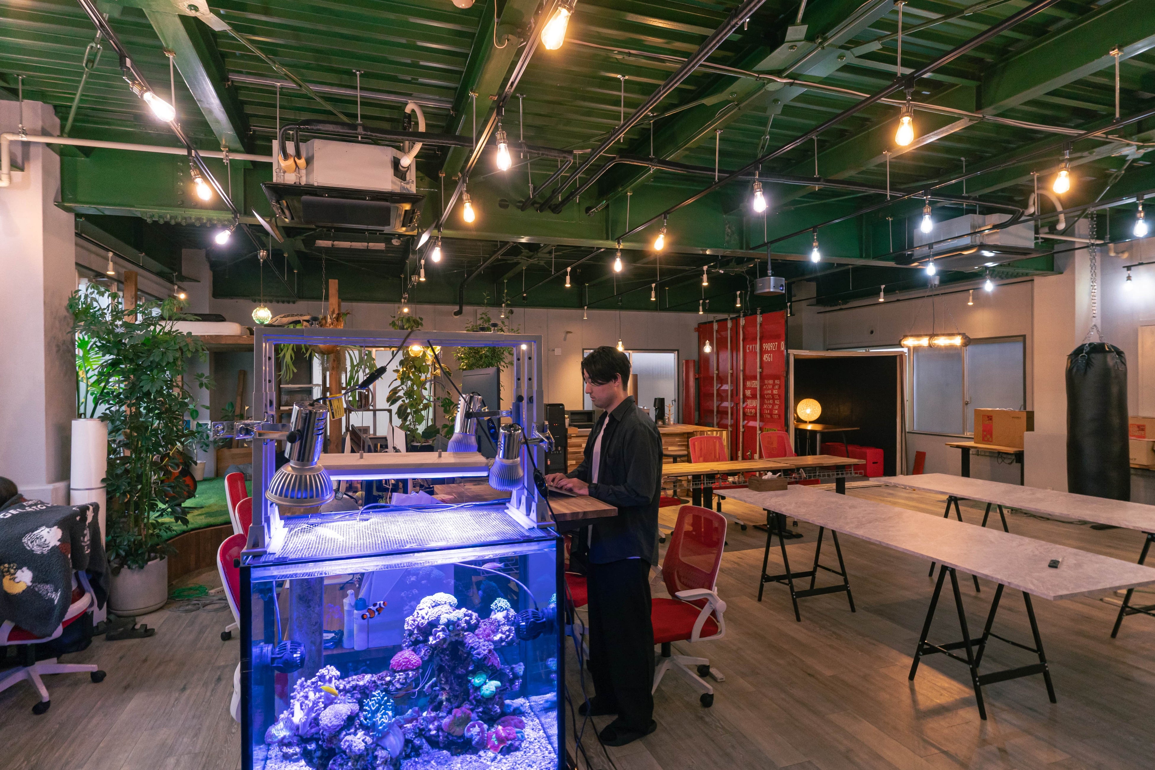 目黒駅から徒歩約10分の静かなビルの1階に位置するこのスペースは、元ガレージをリノベーションしたものです。開放的な業務フロアには昇降デスクを完備し、社員がサービスの開発や運営を快適に進められる環境を提供します。