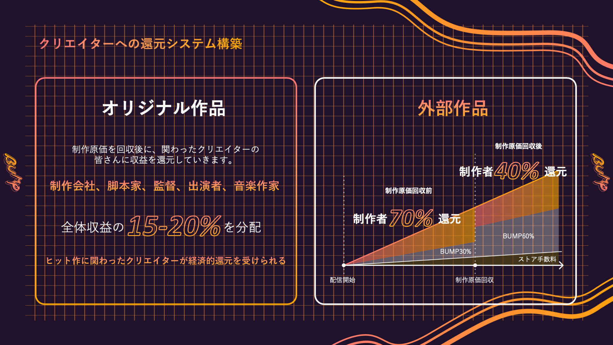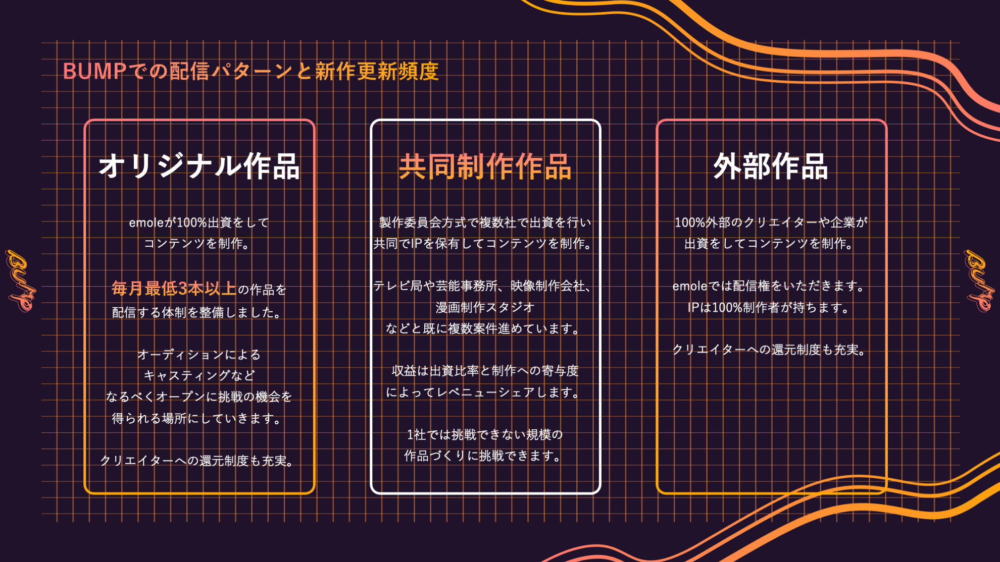 その中でも、BUMPでの作品づくりをするために関わるための3つの配信パターンと新作更新頻度についての説明も行っています。