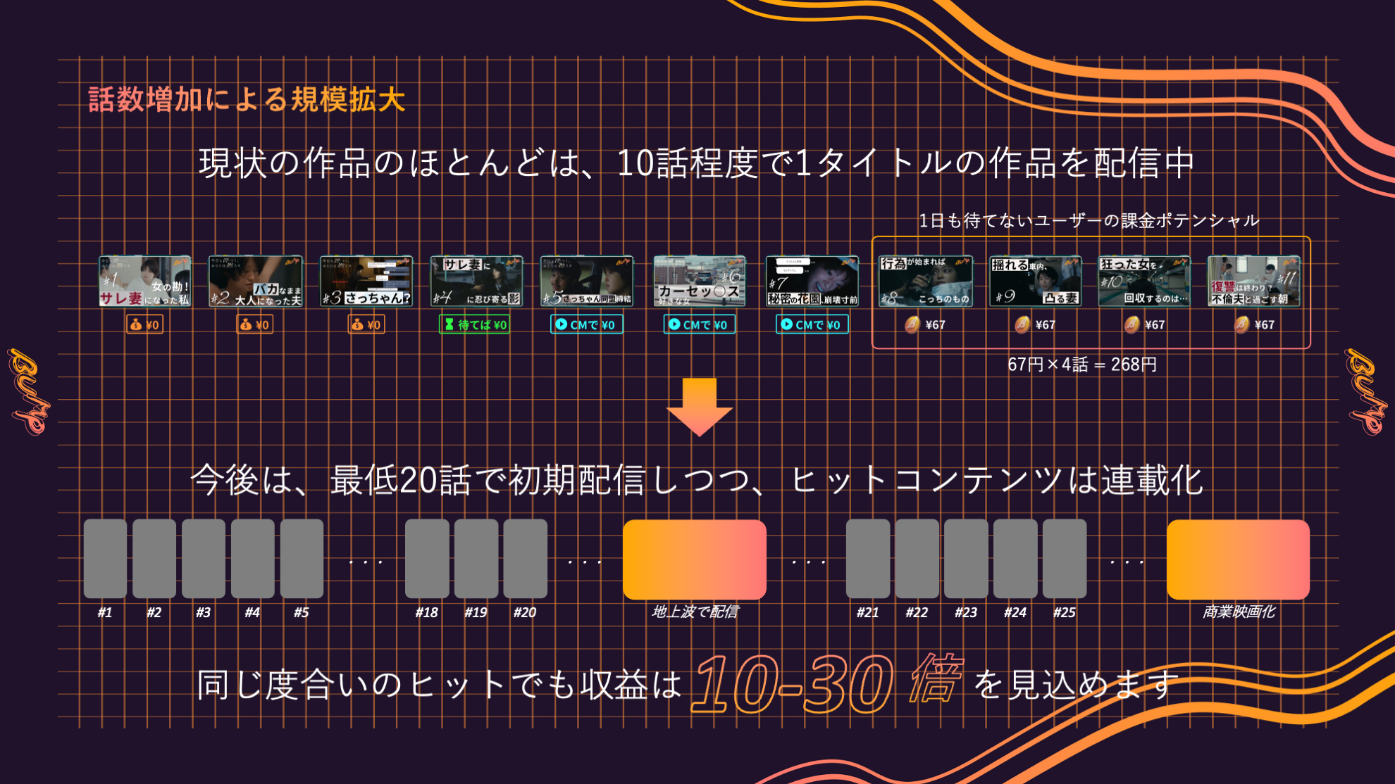 さらに、10話程度の配信が主流となっている現状の作品から話数の拡充にも取り組みます。具体的には最低20話で初期配信しつつ、ヒットに応じて続編配信を行うなど、ユーザーによる課金割合をより増加させられるような構成で作品づくりをしていきます。