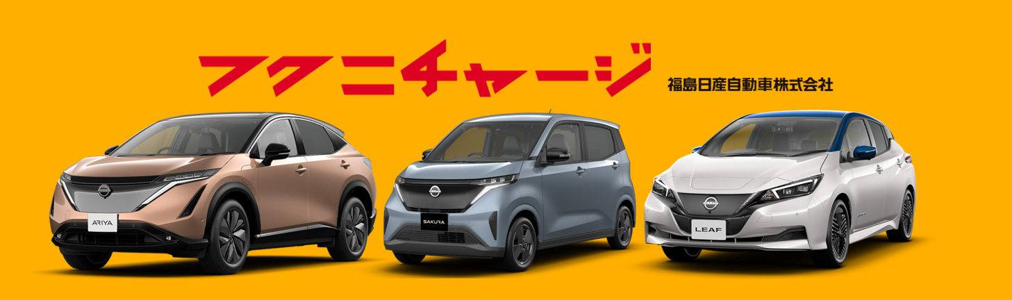 福島日産では、電気自動車への使命を「フクニチャージ」を使って発信しています。福島県内向けに企業CMでも目に触れることができます。フクニチャージとは、フクニチ(福島日産の略称)+チャージから生まれた言葉で、福島日産が提供する商品やサービスにより「福島に元気をチャージする」という意味が込められています。