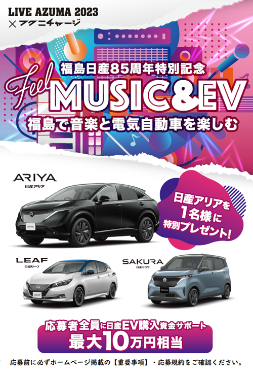 福島日産自動車株式会社(本社:福島県福島市、代表:金子 與志幸)は、LIVE AZUMA2023(主催:LIVE AZUMA実行委員会:福島テレビ株式会社/株式会社クリエイティブマンプロダクション/株式会社フライング・ベコ)とタイアップをし、電気自動車の取り組み「フクニチャージ」のミッション”福島に電気と元気を「いち、はやく」届ける“を体現してまいります。2023年10月6日(金)より、福島県内在住者対象で日産EVフラッグシップモデルである日産アリア1台特別プレゼントキャンペーン「Feel! MUSIC & EV」を開始。当選者にはメーカーオプション付き日産アリアB6(税込6,240,300円)が贈られます。はずれても、来店期間内に福島日産のお店で対象車試乗で日産電気自動車購入時に最大10万円相当の割引が受けられる有効期限付きクーポンをプレゼントします。LIVE AZUMA2023会場では日産EVの展示、10月から本格稼動する福島日産の取組み「CHARGEUR(シャルジュール)」のお披露目、福島市の飲食店「バン才」とのコラボで、フクニチャージドリンク・シャルジュール飯の販売を行います。