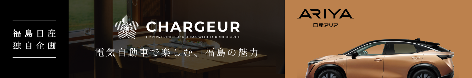 また今回ブース内では電気自動車に関連する福島日産の独自の新しい取り組み、CHARGUER(シャルジュール)をお披露目いたします。CHARGUER(シャルジュール)はフクニチャージ(使命)の下で行われる活動であり、コミュニケーションの前面に日産のフラッグシップEVである日産アリアが立っていきます。CHARGUER(シャルジュール)を通して、福島県において「食などの有形無形の文化資産や観光資源を軸とした領域の共創支援」と「未来の環境貢献や人々の生活を豊かにするための手段となる電気自動車の浸透」「電気自動車の浸透に重要な充電器の普及」を融合する活動を行ってまいります。
