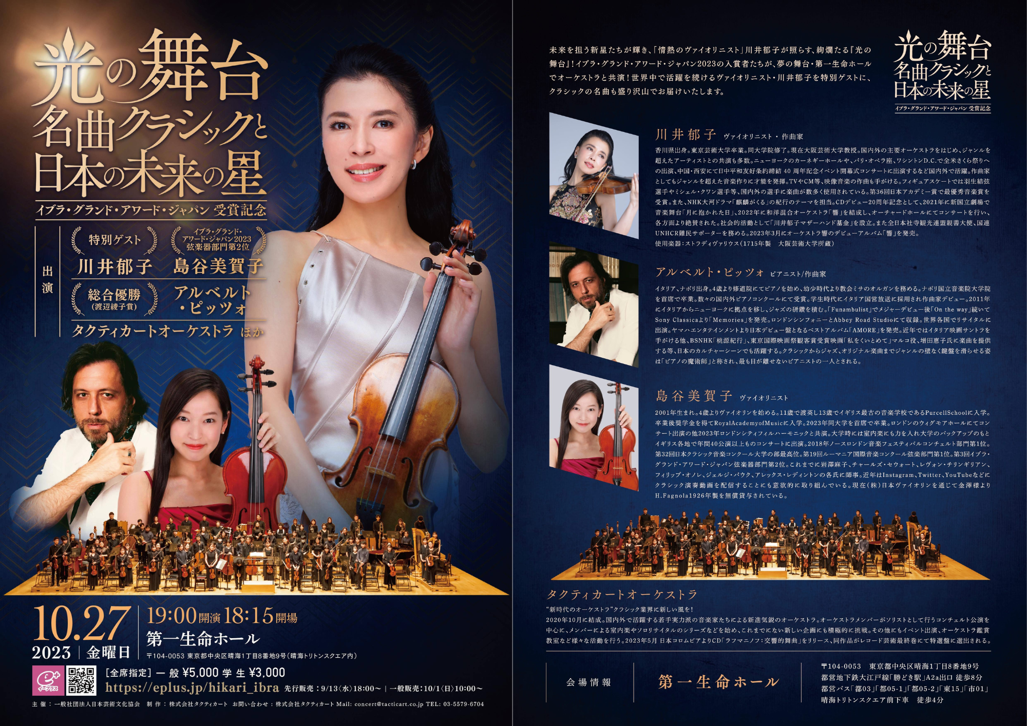 情熱のヴァイオリニスト・川井郁子と、イブラ・グランド・アワードの受賞者たち、そしてタクティカートオーケストラという、これからの日本を担う未来の星たちが一夜に会する本公演は、まさに『光の舞台』と言える内容。MCも交えながら、明るい舞台となる予定だ。受賞者たちの輝かしい演奏を愉しめる、一夜限りの公演をぜひお見逃しなく。