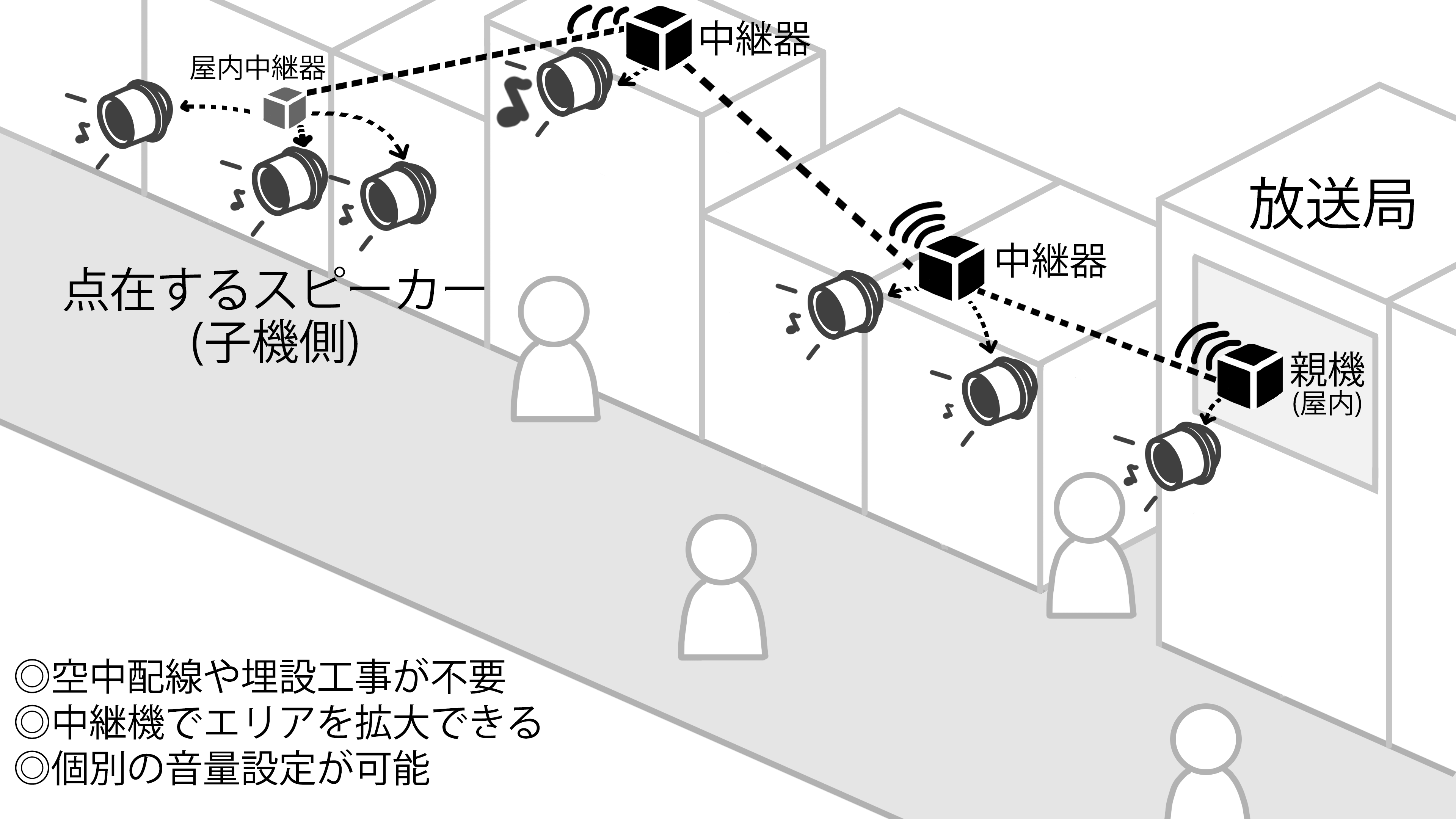 街の再開発やケーブルの老朽化により現在の有線接続の維持が困難になったケースにおいて、ミュートラックスはその代替手段となります。空中配線や地下埋設にかかる工事費用を大きく抑えることができ、電信柱等の月額使用料も発生しません。中継器を設置する事で配信エリアを拡大する事ができるため、数百メートルに延びる商店街をくまなくカバーする事が可能です。また子機はそれぞれ独立したボリューム設定を持っているため、スピーカーの設置位置に合わせた音量調整ができるといったメリットもあります。街の放送局の新たな配信手段として全国の放送局からお問い合わせを頂いています。