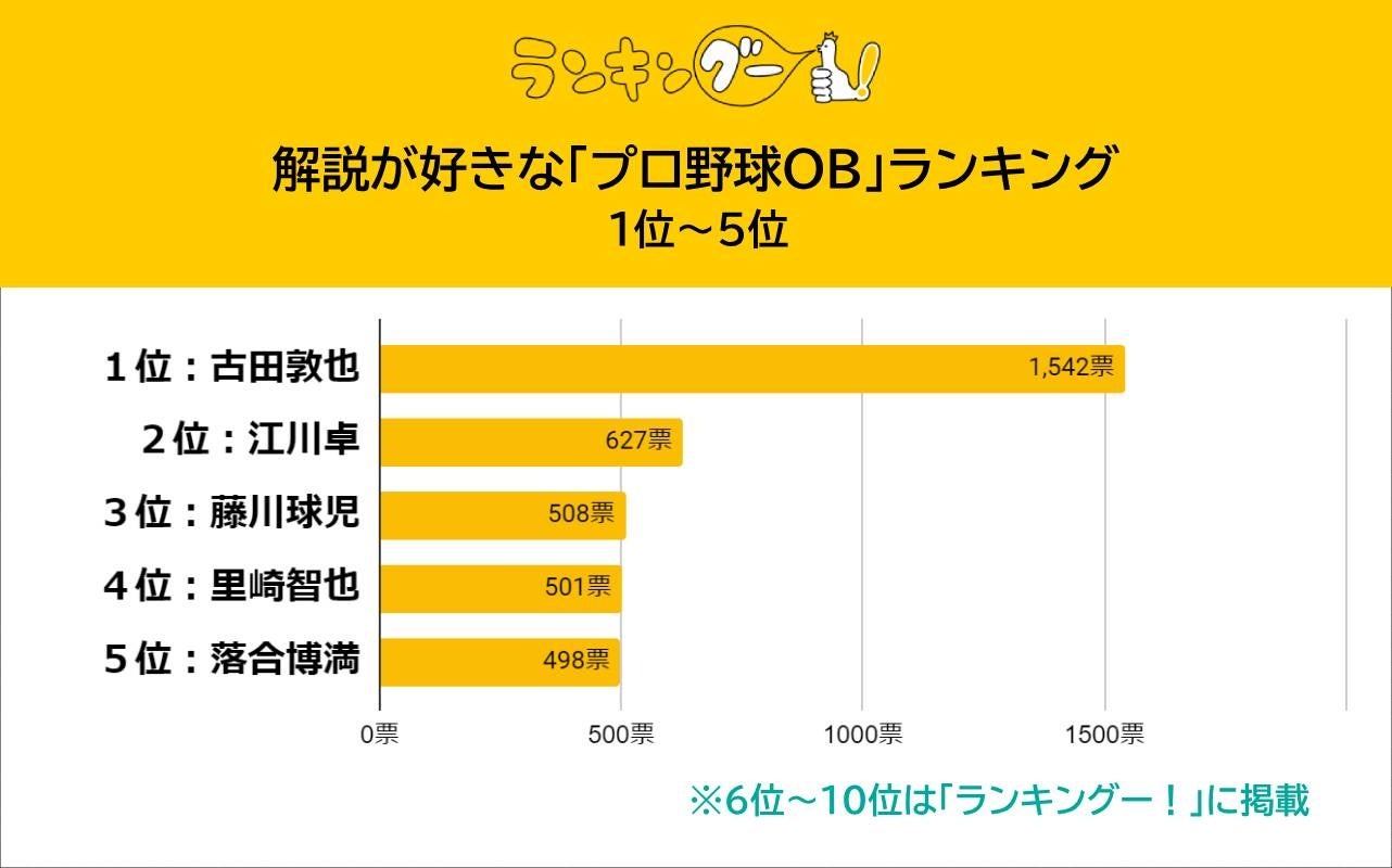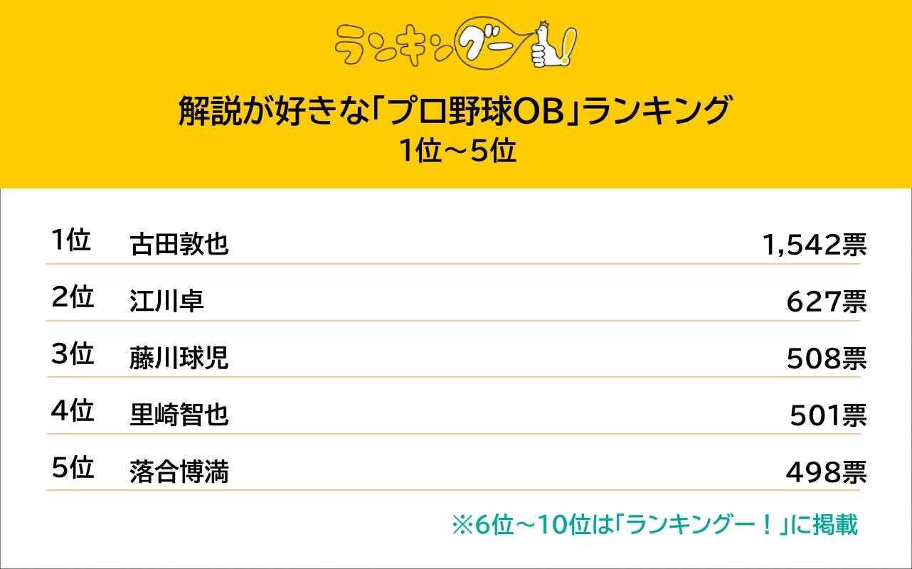 1位古田敦也さんは1542票、2位江川卓さんは627票と、その差は2倍以上。古田さんは解説者としてダントツの人気を集めていることがうかがえる投票結果となりました。