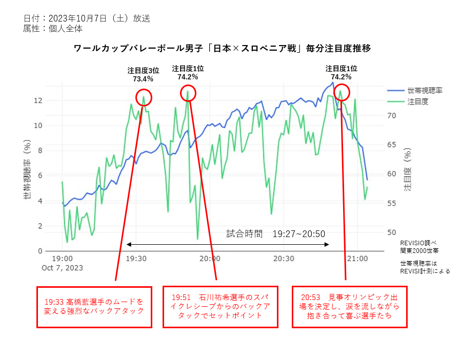 ご家庭に人体認識技術を搭載した機器を設置し、テレビスクリーンへの「注視」を測るREVISIO株式会社(本社:東京都千代田区、代表取締役社長 郡谷康士、以下REVISIO)は、10月7日(土)に地上波フジテレビ系列で放送された、FIVBワールドカップバレーボール男子2023「日本×スロベニア」戦について、どのシーンが一番視られていたのか、毎分の注目度データを使って分析致しました。(注目度が高いことは、テレビの前の視聴者がくぎづけになったことを表します)