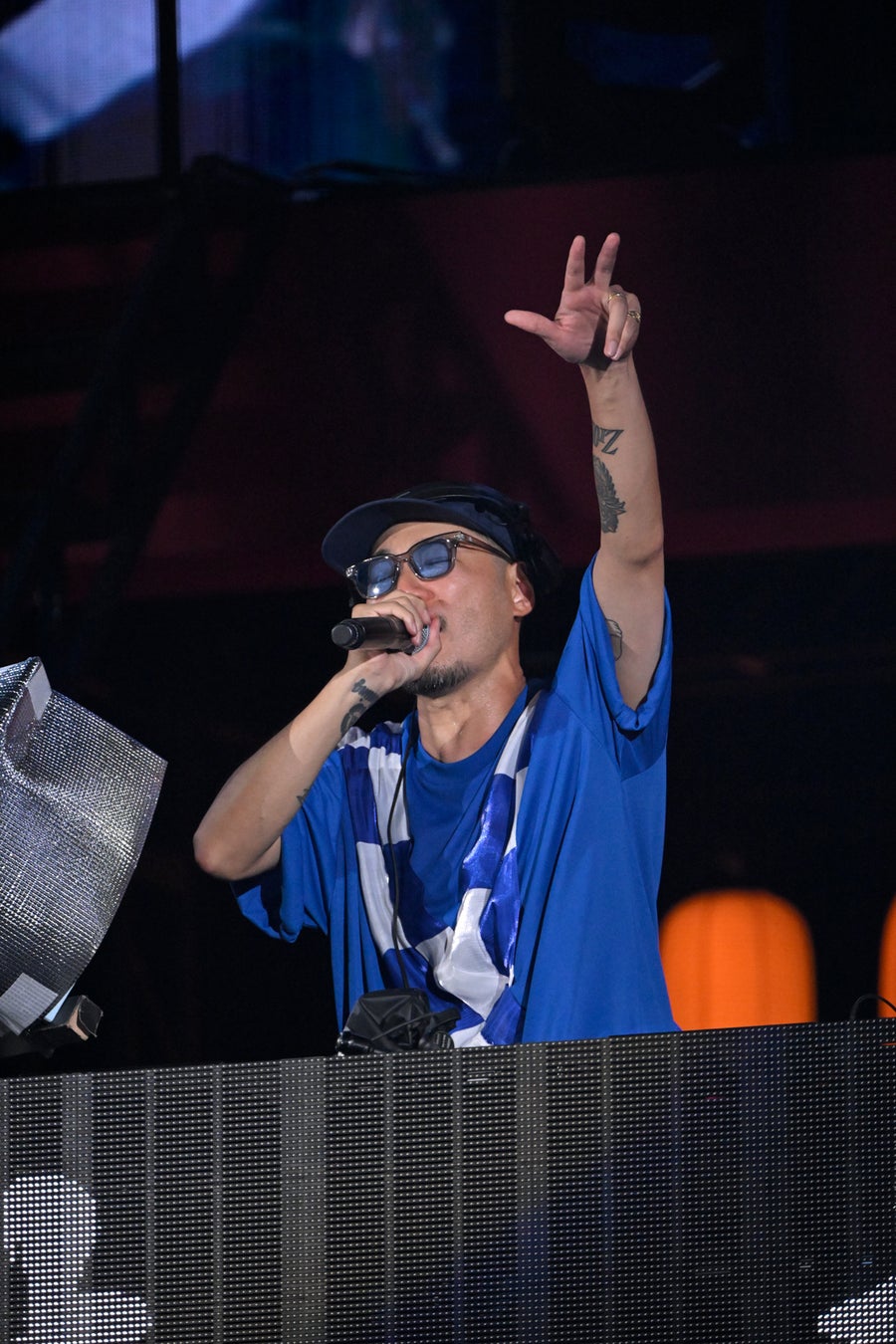 弱い自分を曝け出し、だからこそ共に歌うことを誓った「黄金魂」。ステージ前方で曲に合わせて幾つもの炎が燃え上がる。DJ・バックセレクターのThe BK Soundのリクエストによる「Hyper Something」では、長年の盟友であるINFINITY16のTELA-Cがアニバーサリーをセレブレイトする。