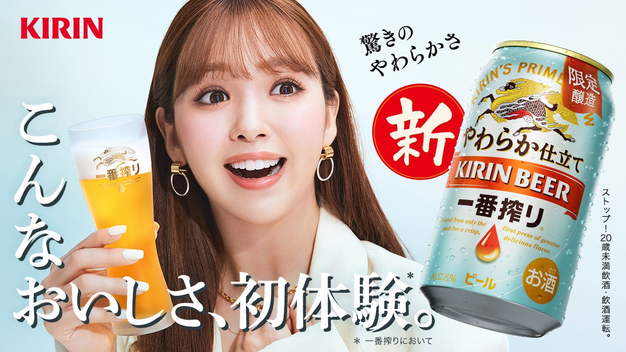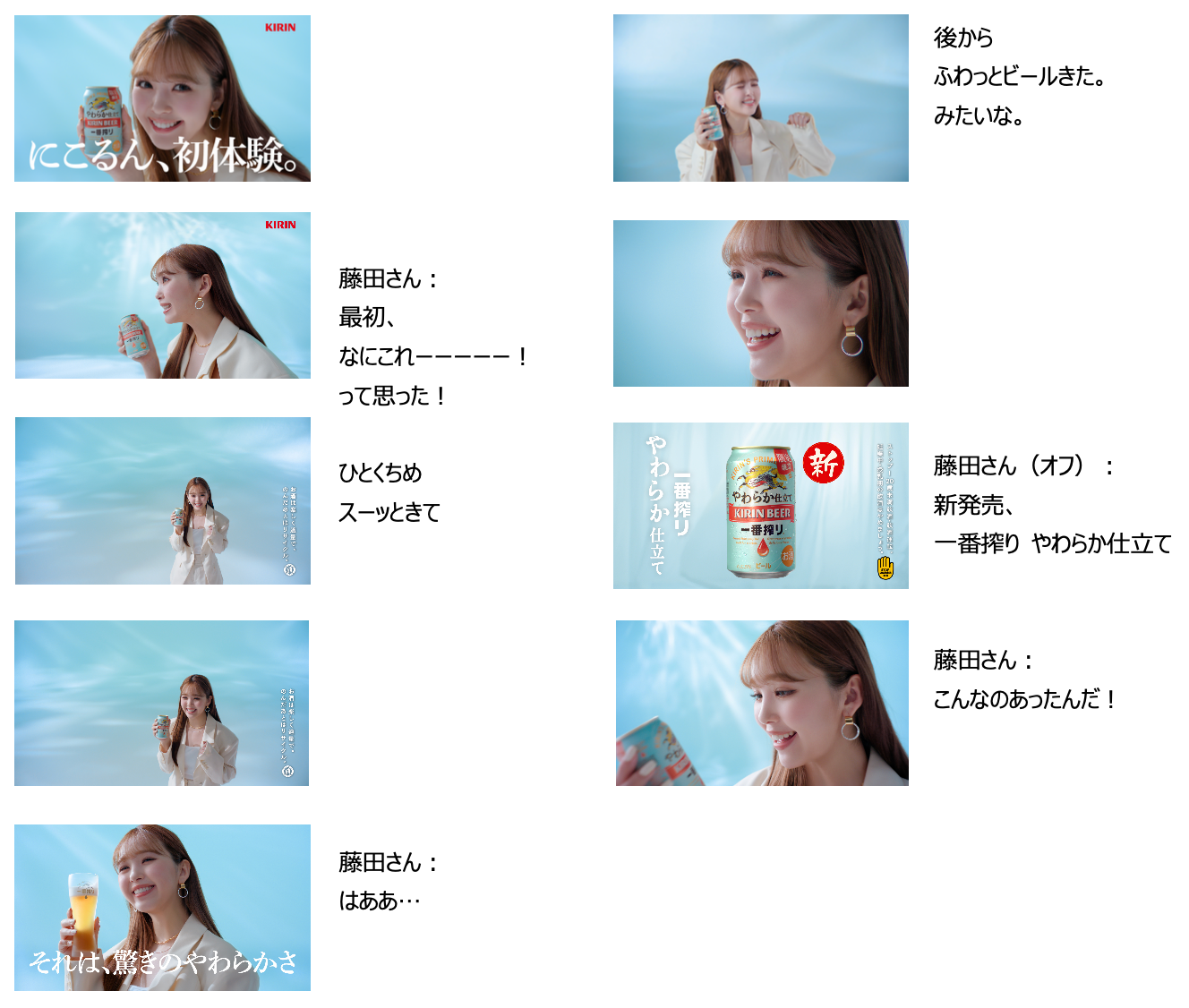 今回のコミュニケーションでは「にこるん、初体験。」「それは、驚きのやわらかさ。」というキャッチコピーのもと、藤田さんが初めて体験した「一番搾り やわらか仕立て」のなめらかなおいしさを、ナチュラルな驚きと幸せそうな表情、本音の言葉で語る本作品を通じて、“苦い”“重い”という従来の概念を覆す新時代のビールの誕生を訴求していきます。