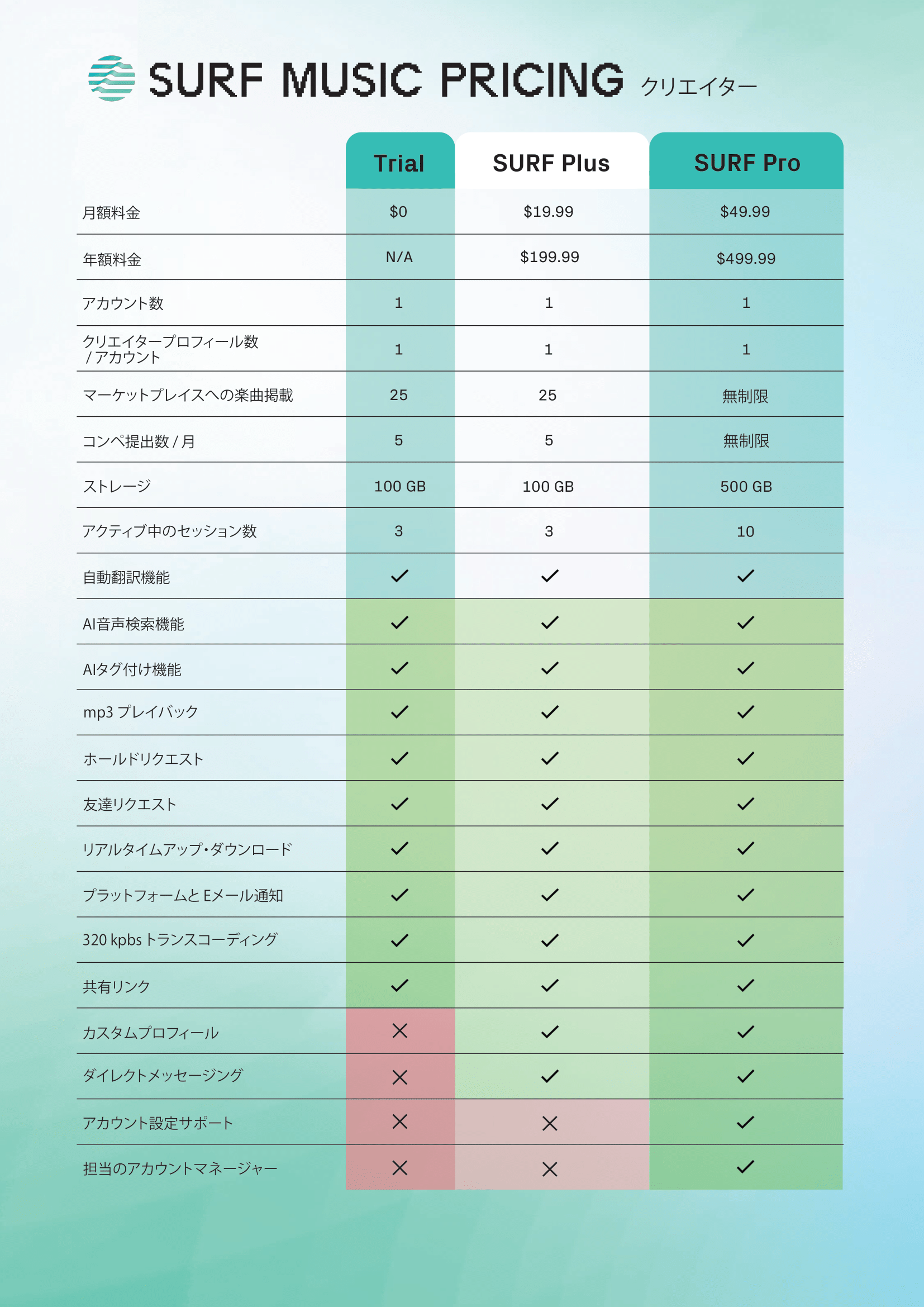 SURF Musicでは、SURF PlusとSURF Proプランの2つのプランを用意しています。低価格プランのSURF Plusでは、毎月最大25曲までのマーケットプレイス掲載と、最大5つまでのプロジェクト掲載、そして100GBのファイルストレージを利用できます。一方、上位プランのSURF Proのクリエイターは、プロジェクト掲載およびマーケットプレイス掲載が無制限で利用できるほか、ストレージは500GBまで使用可能。さらに、担当のアカウントマネージャーとカタログサポートもSURF Proのみで利用できます。