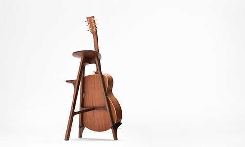 生活空間の中に楽器の居場所をつくることを目指してヤマハがデザインし、家具メーカーMEXARTS社が製造した、アコースティックギタースタンドとクラシックギターフレームです。ギター演奏時にはそれぞれハイスツールとベンチとして使用できます。