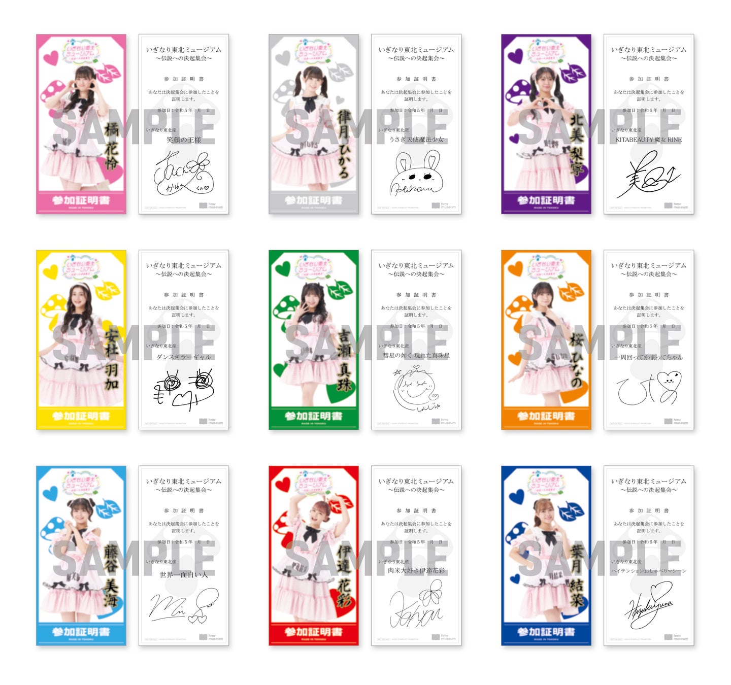 本”決起集会”にご来場いただいたお客さまに、先着で「決起集会 参加証明書(ミニカード)」(全9種類)を入場券1枚につきランダムで1枚プレゼントいたします。