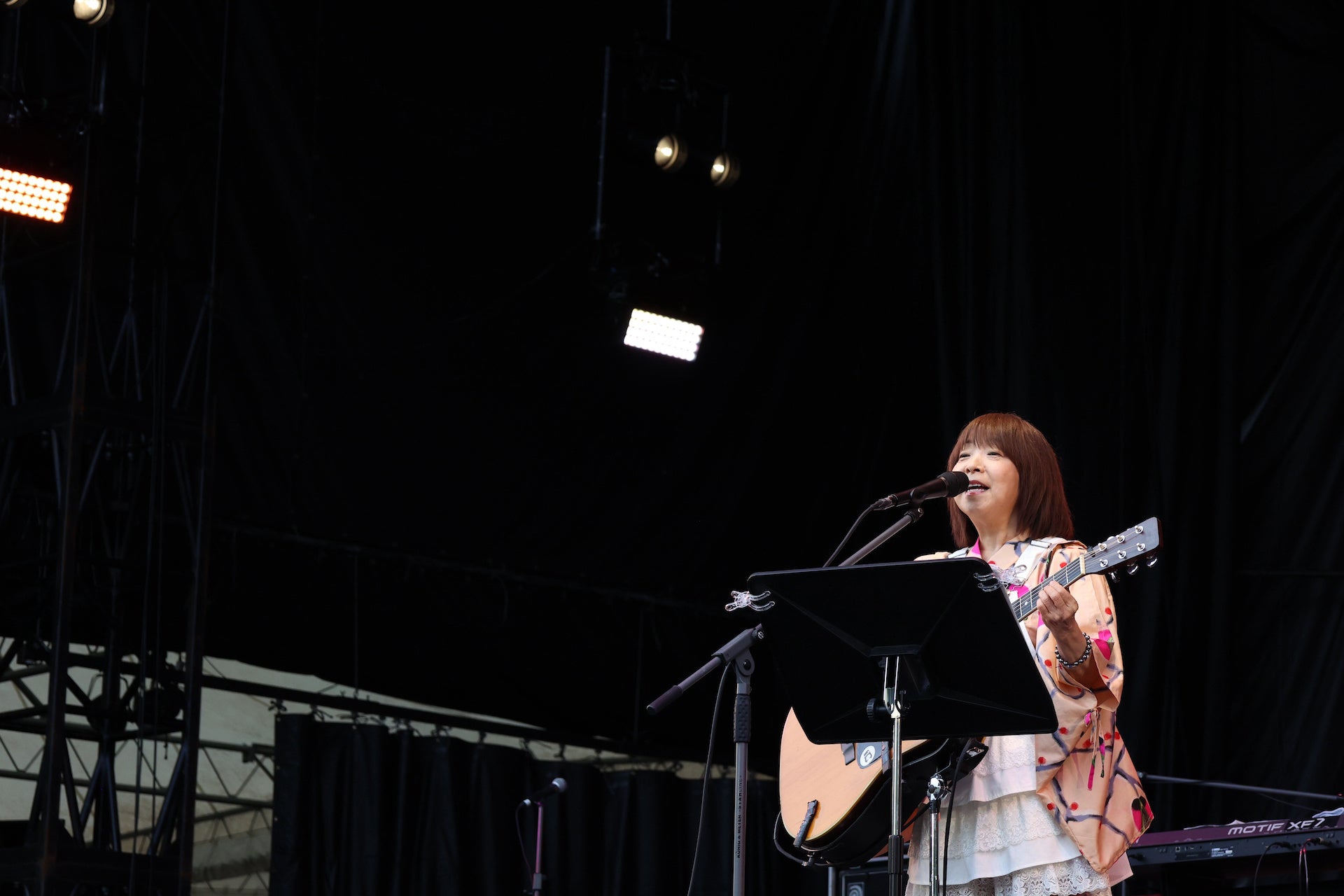 ミニのオーバーオールでのいで立ちにざわめきが起きていた。「こんにちは。私が座敷童です。すごいですね。今日はフェスということでやってきました。今日は初めて参加させていただきます、イルカです」とあいさつ。大拍手が起こると「うれしいですね。老若男女が集まって。フェスって言うからね。どうしようかな。ノレる曲はないよ。お昼食べた人は、お昼寝タイムでも良いよ」と会場を見渡していた。スタッフからアコースティック・ギターを受け取ったイルカは、「♪みんな同じ生きているから」と歌うと、「ひとりにひとずつ大切な命」と会場から歌声が。「うれしいね。良かったら一緒に歌って」と続けると、その呼びかけに引き寄せられたトンボがイルカの元に舞い降りた。気付いたイルカは「トンボが止まった。大自然の中で歌えるのはうれしい」と目を細めていた。ほんわかした空気の中で奏でられた「まあるいいのち」では、イルカがつま弾くアコースティックギターに合わせ、テントの中で見ている家族連れや、シートの上で寝そべりながらステージを見ていたカップルが声を合わせた。終盤には1975年に大ヒットした「なごり雪」を披露。イントロのピアノが流れた瞬間、「おぉ」という歓声が上がっていた。イルカは昨年50周年、その間に古希も迎えたと語り、「25歳の孫がいる」と明かすと、どよめきが起きていた。