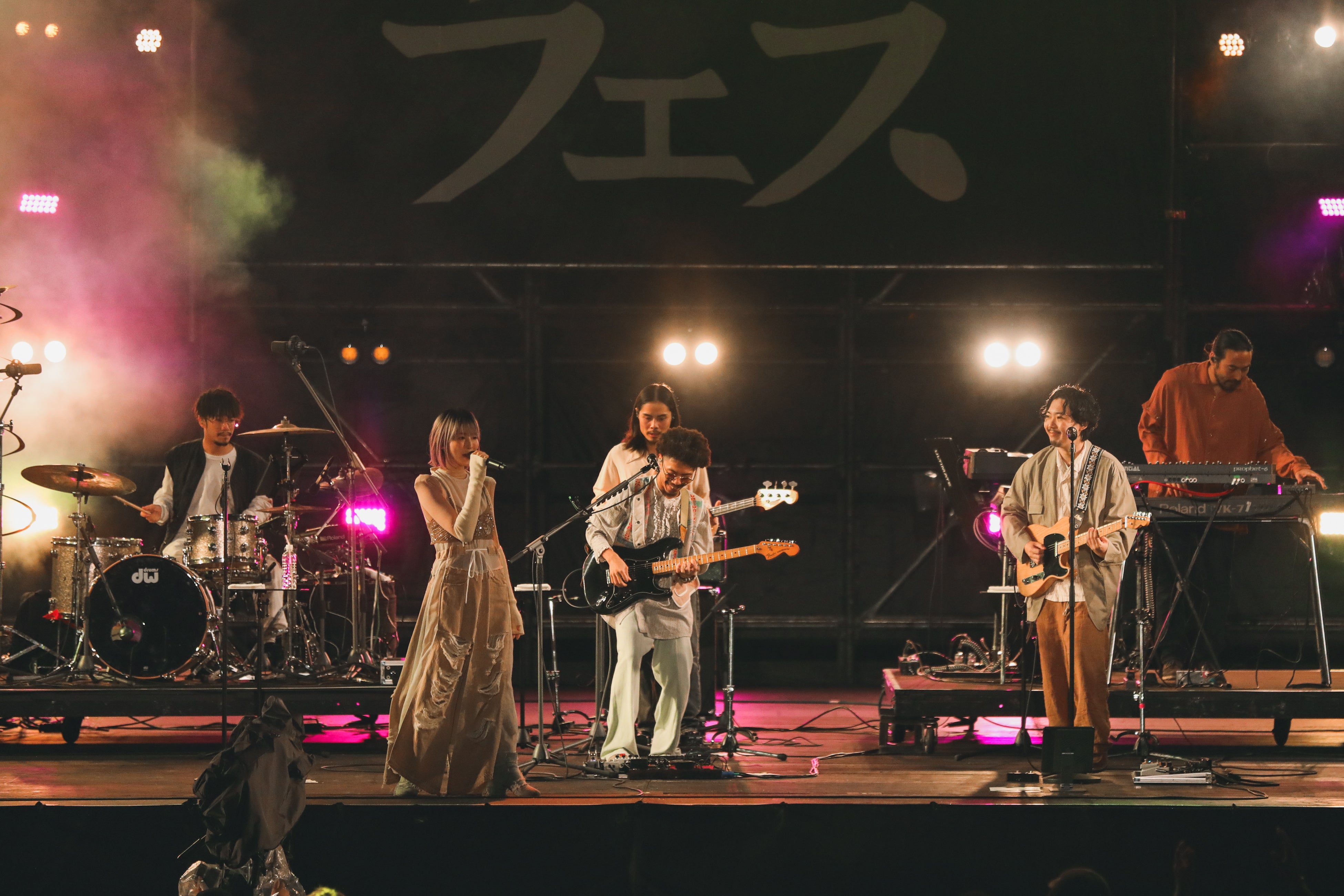 けど…。あれ? 今日はやんでいます」と空を見上げ、声を弾ませた。中盤には「大切な音楽仲間」と川崎鷹也をステージに招き入れると、橋口は「シュッとしたメガネ(川崎のこと)と、比較的丸顔のメガネ(橋口自身のこと)でコラボしたいと思います」と明かし、wacciの代表曲「まばたき」で共演。1番は因幡始のキーボードに合わせて、川崎が悲哀ある歌声をゲレンデに響かせた。2番は橋口の歌を軸に、サビなどで川崎が声を合わせる、米フェスだけの特別な演出で聴衆を魅了。親交を重ねて来たからこそ実現した奇跡の歌声に、多幸感が満ちあふれていた。雨が強くなった会場に視線を向けた橋口は「ちょっと身体を温めて行きませんか」とマイクとタオルを手に、ステージ左右に伸びた花道へ一歩踏み出して行く。橋口の誘いに応え、手にタオルを持ったファンがポップな「フレンズ」のメロディーに合わせ、水色やオレンジ、赤など色鮮やかなタオルの花を咲かせていた。村中慧慈のギターソロでも、タオルを振り回し続け、“どこにもない物語”をファンと作り上げていった。大盛り上がりになった会場には、「アンコール!」の声も飛んだ。拳をあげる観客に向け橋口は「ホールツアーやるんで、アンコールはそこから始めたいと思います」と再来を約束していた。