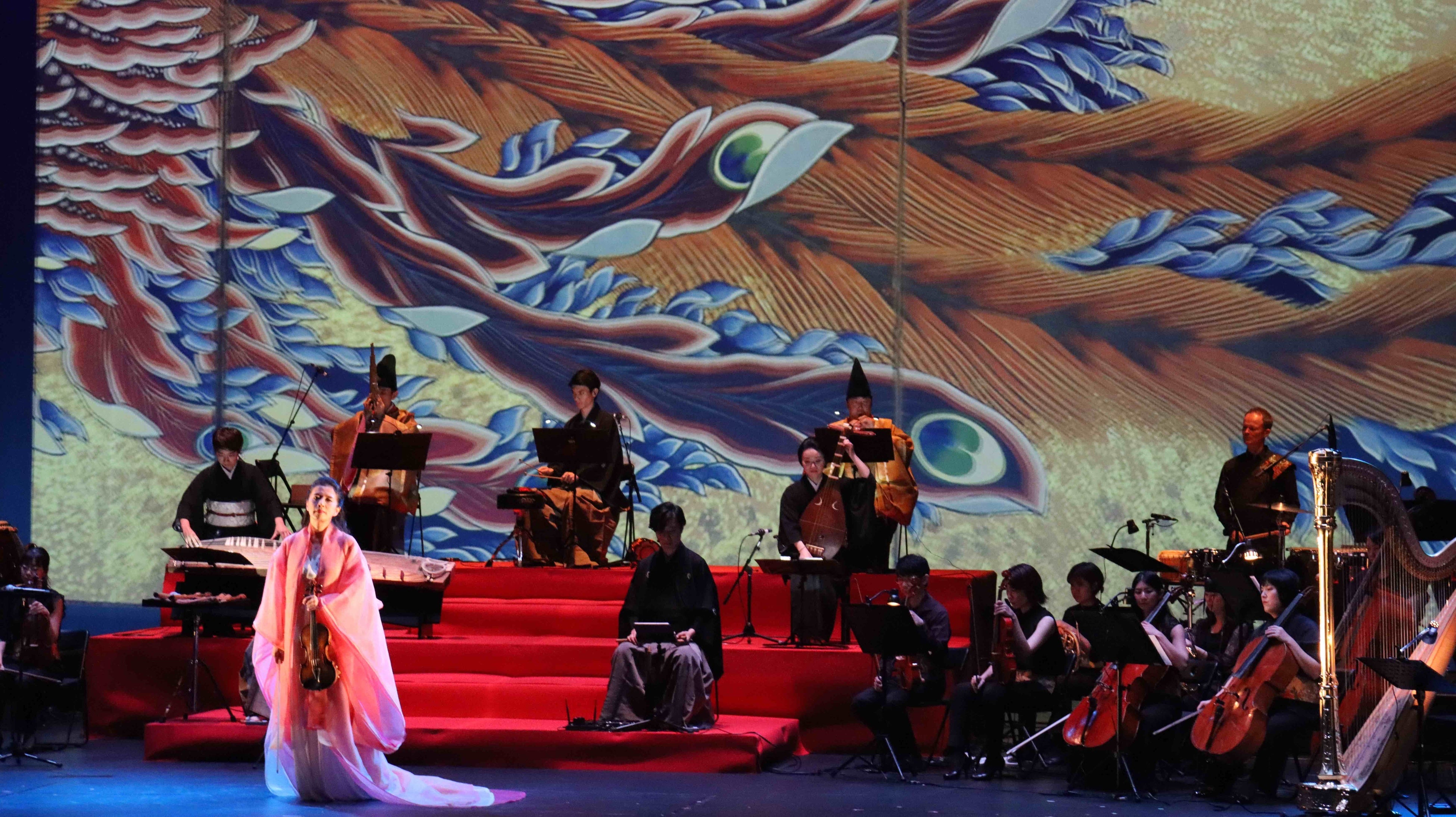 後半も驚きと高揚感は続く。「源氏物語」をモチーフにした「夕顔」では、琵琶の音が鳴り、夕顔に扮した川井がしっとりとヴァイオリンを奏でる。あっと驚くような光源氏の雅な世界が映像でも表現され、観客は平安時代にタイムスリップだ。音が鳴るたびに、それまでどの楽器なのか目で追って確認していたが、もはやそうするのをやめて、ただその世界に身をゆだねてみた。川井が取材で語っていた「和と洋を超えた一つの音楽。その音楽にとって必然ということが大事」とはこのことだろう。必然がこんなにも心地いいものとは。