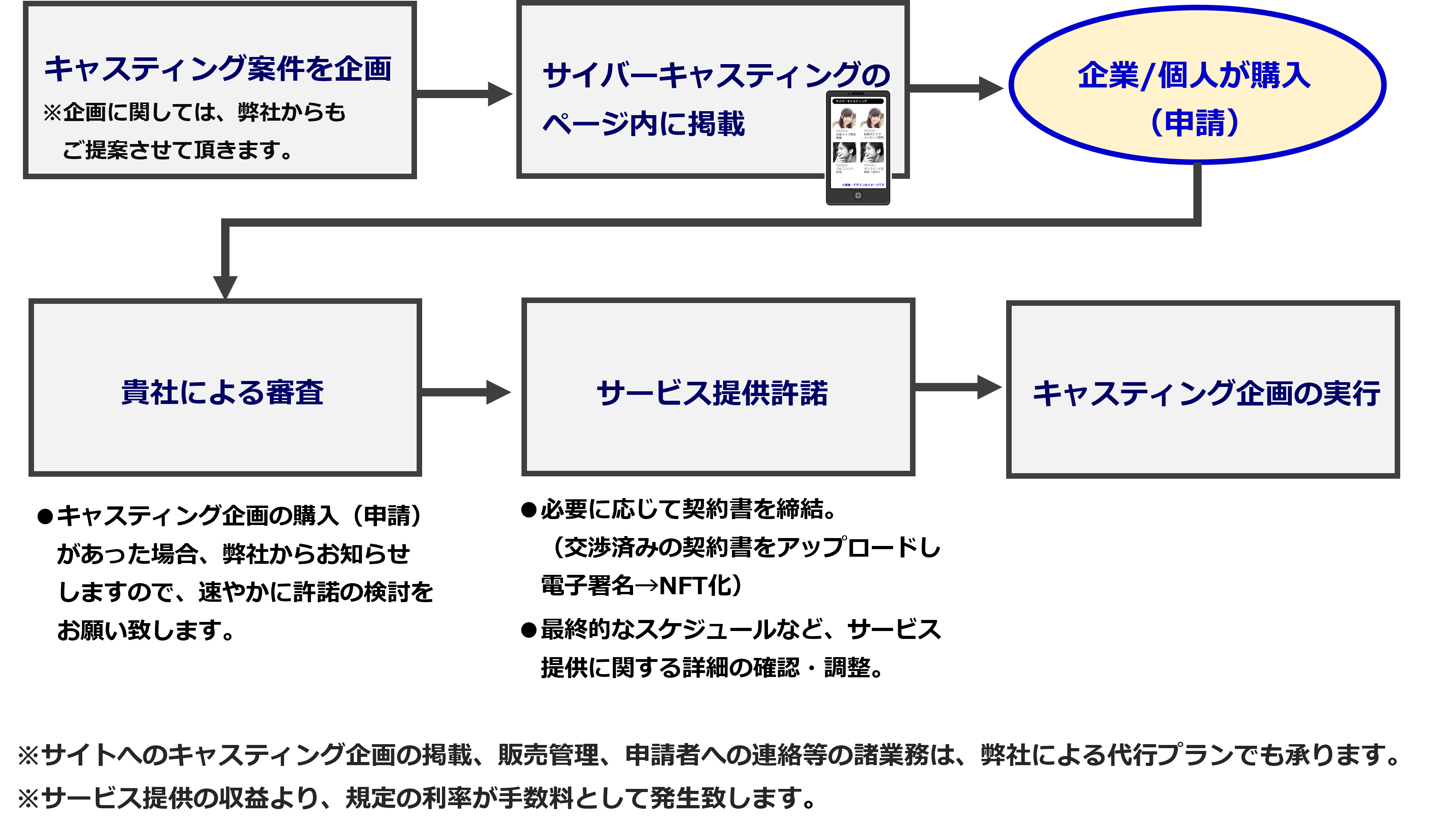 「Cyber Casting」は、タレントやクリエイターがイベント出演、広告への肖像利用、講演等の“キャスティング企画”を「CYBER STAR」内のNFTモールに出品することができ、その企画を希望する企業や個人はモール内で購入ができるというサービスです。