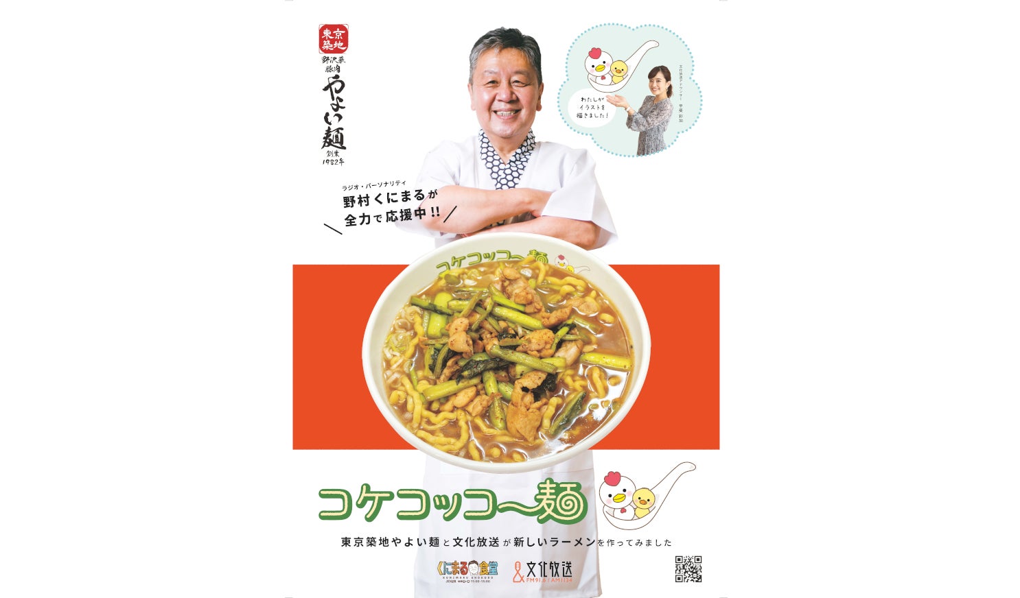10月27日(金)の『くにまる食堂』ではラーメンライター井手隊長と「東京築地やよい麺」の料理長・山本高志さんが出演して、「やよい麺」ヒストリーから「コケコッコー麺」誕生までを語ります。また、11月3日の「浜祭」では、「コケコッコー麺」の汁無し麺と、具を使った丼を販売します。是非お楽しみに。