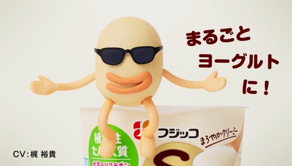 「まるごとSOYカスピ海ヨーグルト」のおいしさを伝え足りないと嘆いている「ダイズ君」をコミカルに表現した声優・梶裕貴さんの演技力に注目です。
