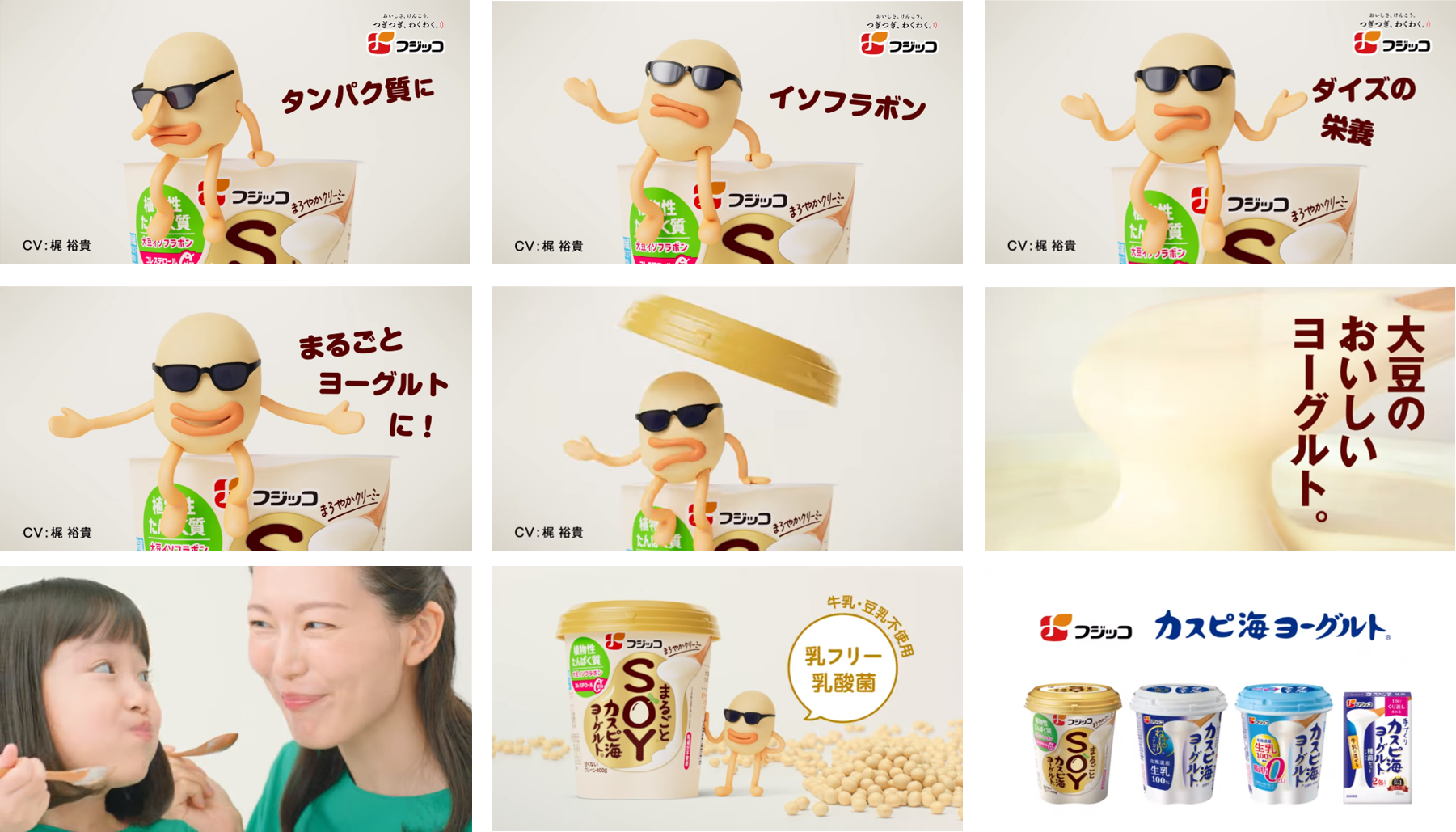 「まるごとSOYカスピ海ヨーグルト」のおいしさを伝え足りないと嘆いている「ダイズ君」をコミカルに表現した声優・梶裕貴さんの演技力に注目です。